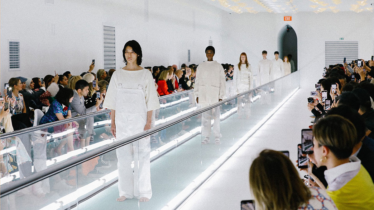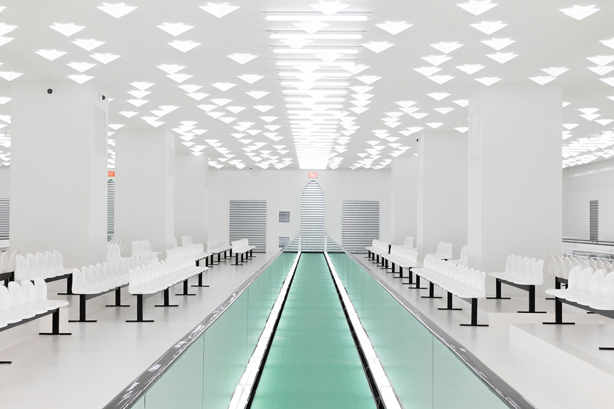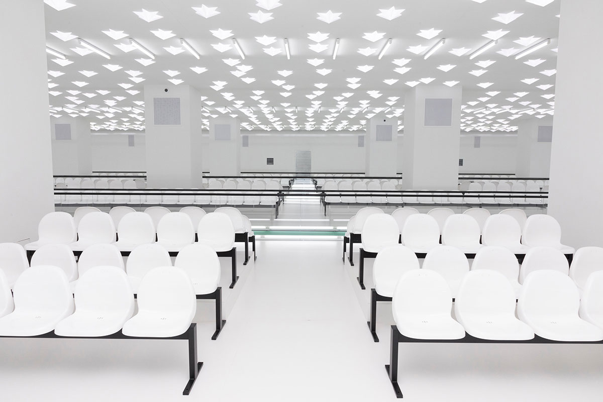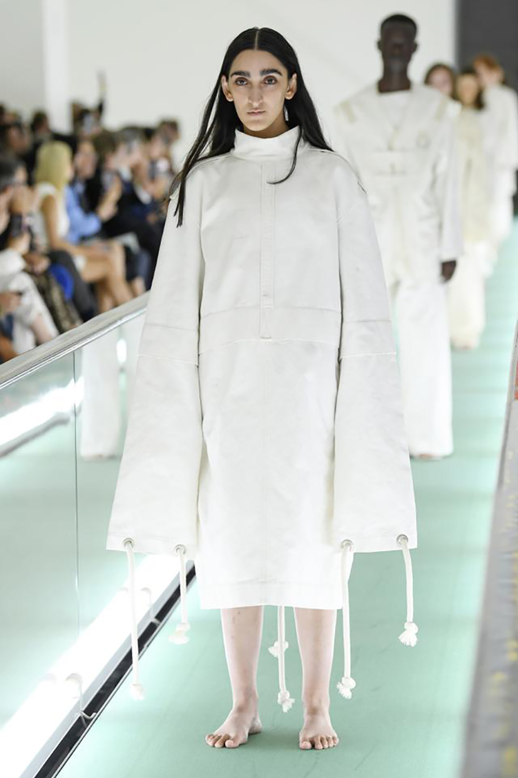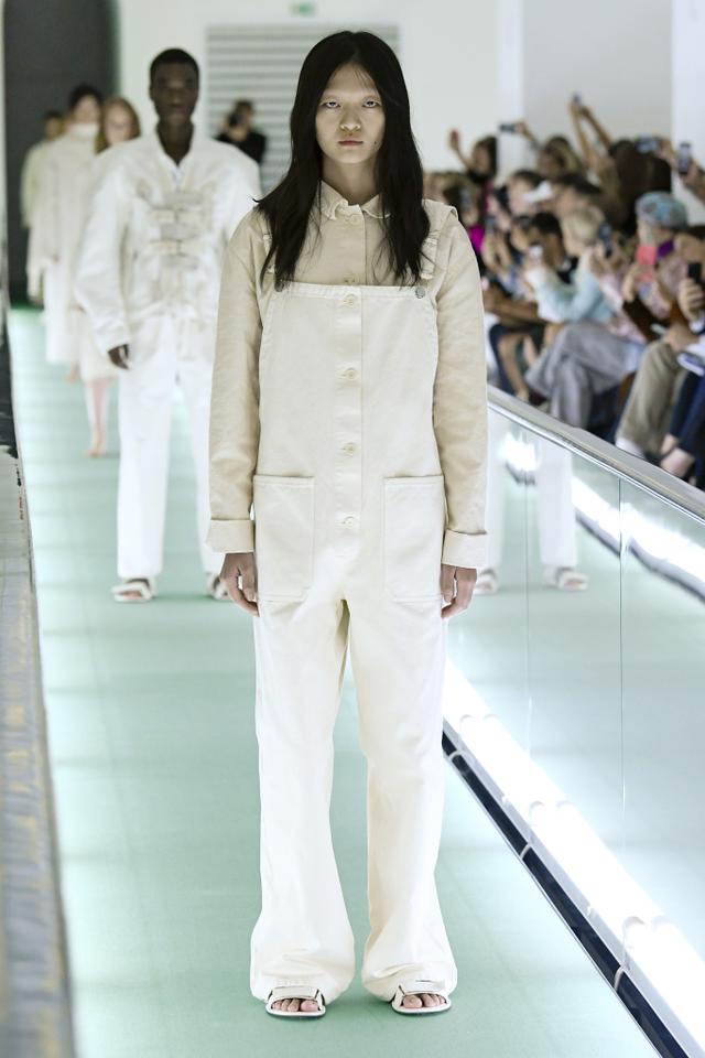 GUCCI SS20秀场,选在了自家的米兰GUCCI HUB,简洁空间,白色空间,传送带秀台,实际秀场中模特有的需要走秀,有的靠传送带传输。而创意总监Alessandro Michele也在Gucci 2020春夏系列设计中,加入了一部分很不Gucci的设计,一系列纯白色的服装被男女模特展示,这部分服装更贴近最原始的色彩,像是未经染色的白坯布,模特们则像被传送带传送出来,异常“死板”。