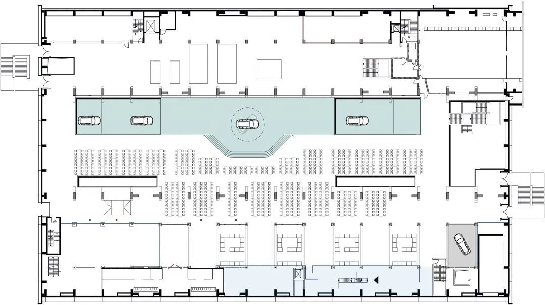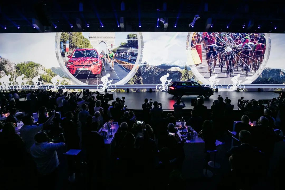 在活动中出现了4辆科迪亚克展示车,它们行驶在舞台的两个坡度为19.5°的坡道上,与全景的视频进行互动。高空杂技演员的表演增强了空间的沉浸感,与多媒体视频和车辆的运动相融合,创造了一个令人深刻的整体印象。