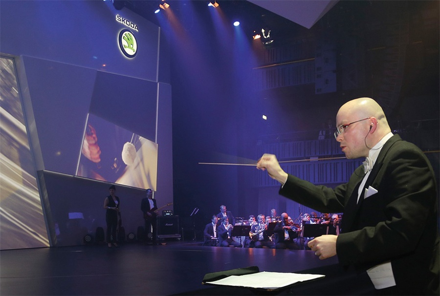 现场演奏的交响乐形成了观众情绪上的张力弧线,将斯柯达Superb的传统从过去传递到了现在,并在公司的传统与现代之间建立了联系。交响乐的第一部分由古典管弦乐队组成,然后在第二部分(当新的Superb出现前)风格进行变化,更具有现代元素,三种独奏乐器:电吉他,键盘和小提琴加入了进来。