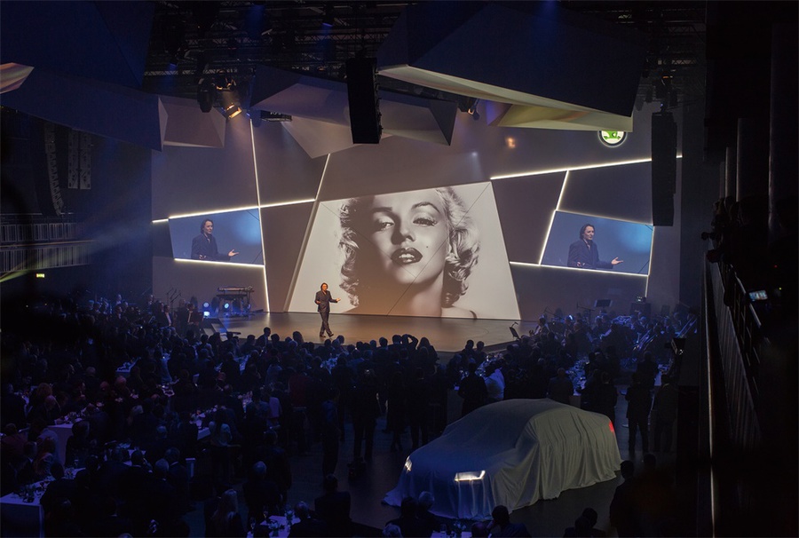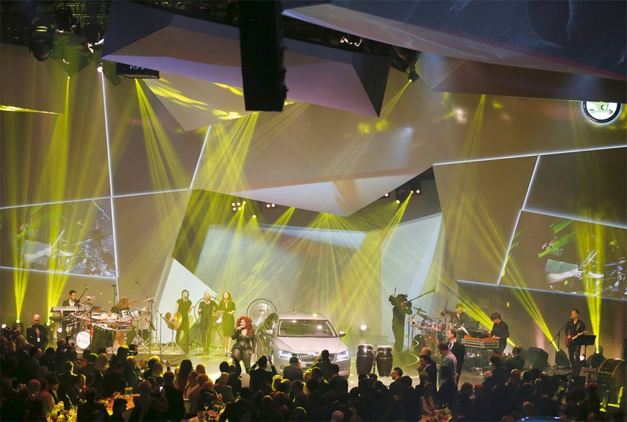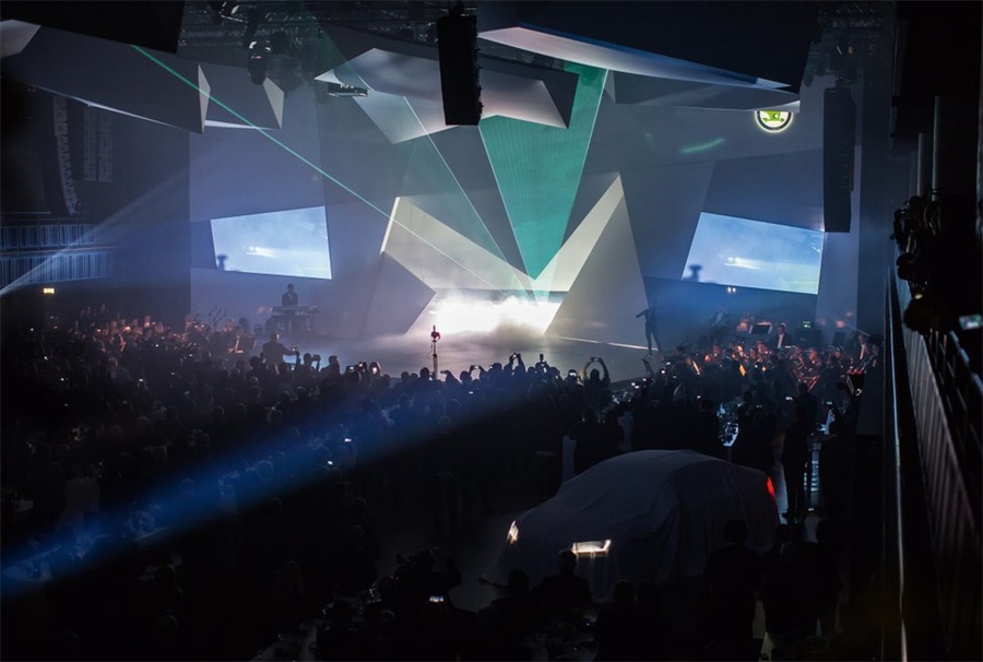 为了使车辆的设计成为人们关注的焦点,并强调传统与现代之间的联系,开发的新车登台与视觉概念依赖于 “多边形复杂性”的设计语言,如舞台背景,舞台地面形状,天花上的装饰,舞台背景上的投影视频的形状无不展现了多边形的视觉语言,这是正是通过舞台设计和各种装饰而形成的设计元素,优雅地体现了设计语言与新的斯柯达Superb的关联性。