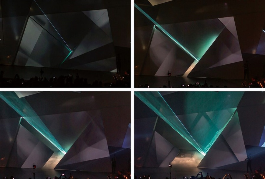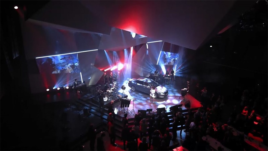 伴随着交响乐戏剧性的结构,充满现代感音乐的出现自然地预示着新车即将揭幕,观众的目光聚焦到了舞台背景上的三个大投影面上。