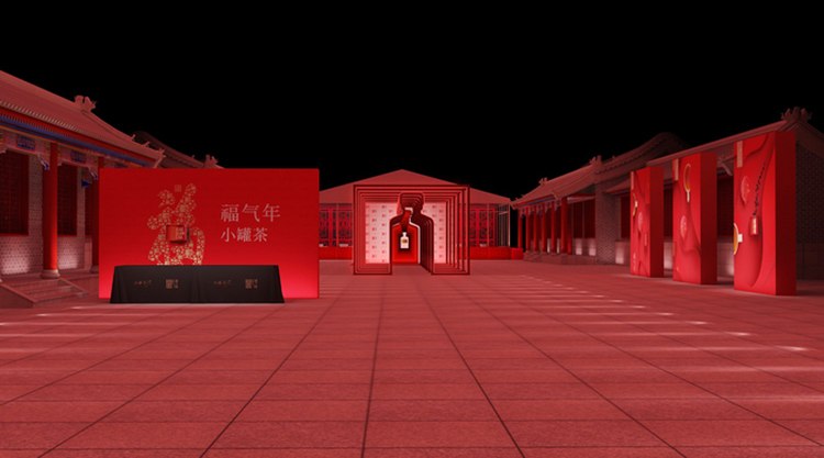 主KV风格简约,大面积的留白营造出肃穆、高级的视觉效果。画面紧扣中国红的主题色,以错落有致的小罐茶轮廓构成恭王府“天下第一福”的形象,突显活动主题。福字的中心,将本次活动的主角之一——“天下第一福”新年定制茶作为点睛之笔,颇具视觉冲击力。