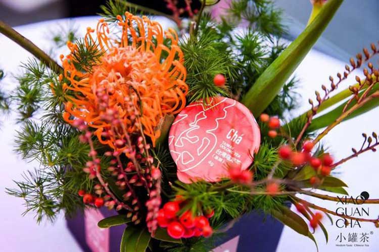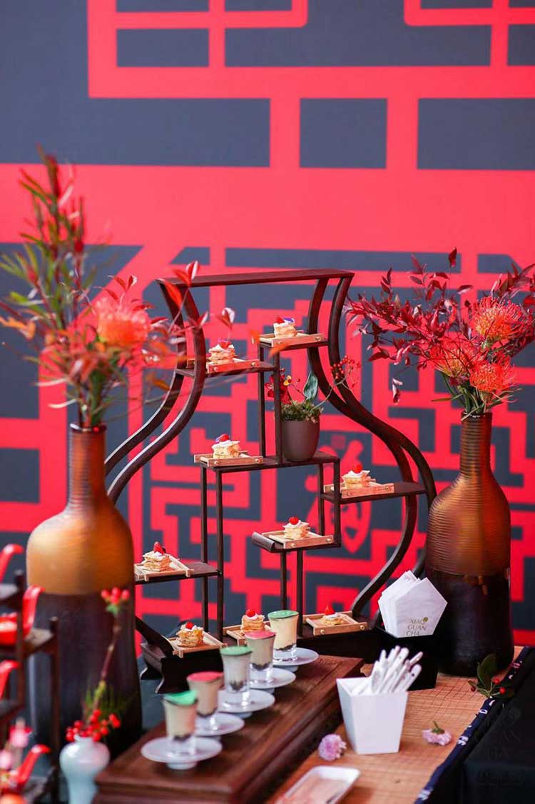 本次活动的茶歇糕点由糕点师特别设计,巧妙地模仿了小罐茶的造型。盛放茶歇的容器都选用古朴的茶具,借助木质、骨瓷与膏腴甜点之间质地和色彩的反差,在甜美和古朴、丰盛和清冷中制造了富有美感的平衡。高颜值的茶歇糕点被置于古色古香的博古架和茶海间,周围点缀着精美的花艺。本次活动特邀花艺大师倾力创作,选用了龙珠、南天竹、松枝、文竹等在普通花艺中罕见的素材,借助点到即止的高饱和度色彩和意境空灵的留白,构建出如工笔水墨一般的整体效果。