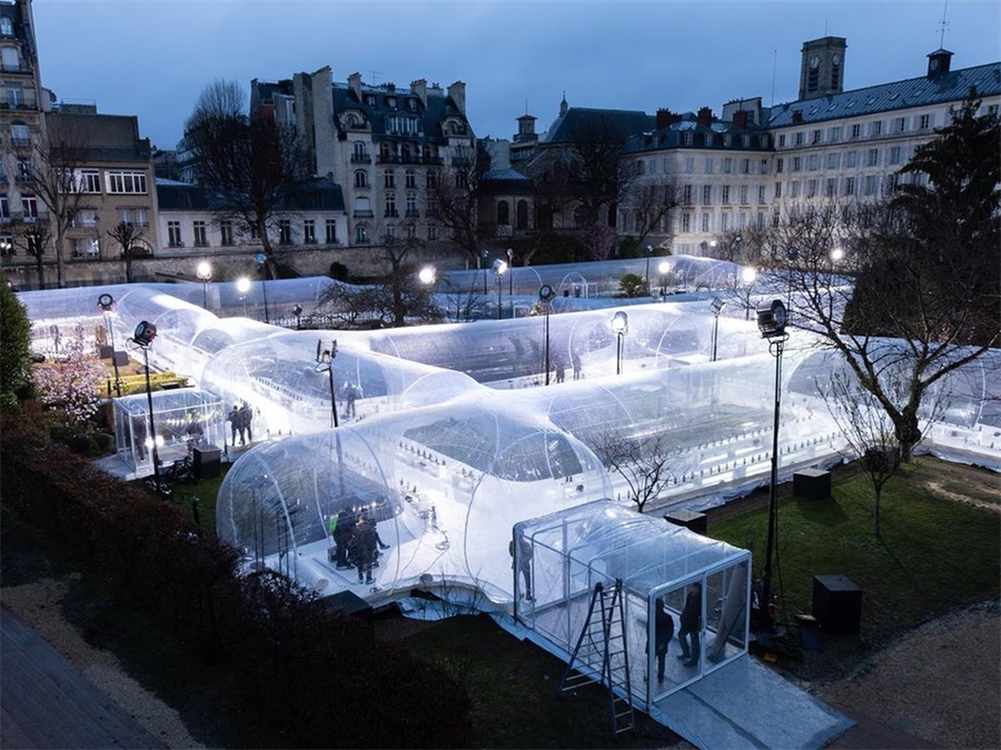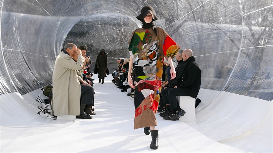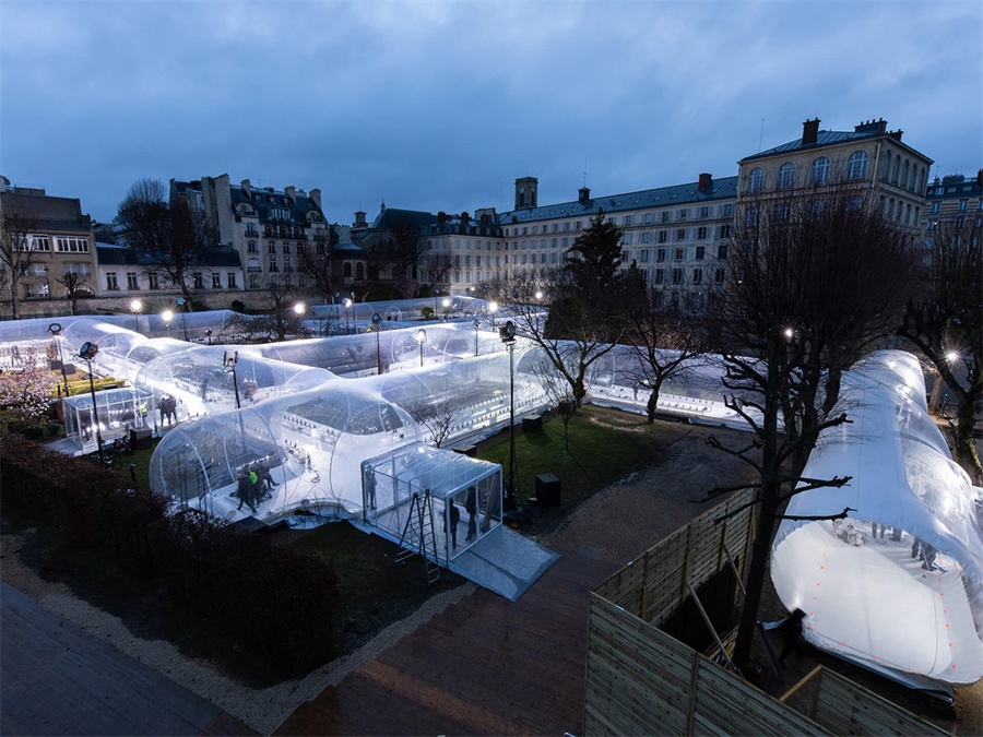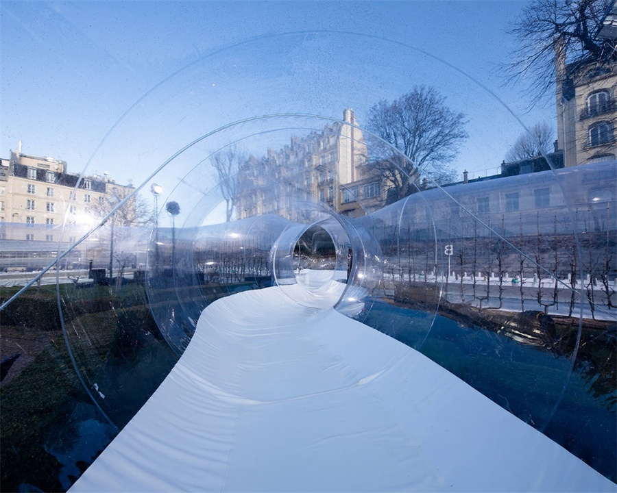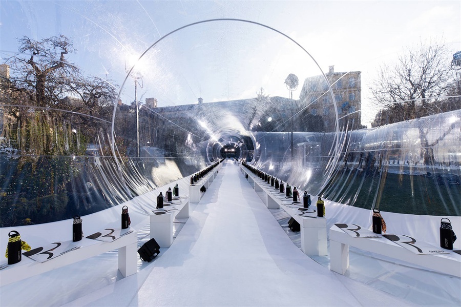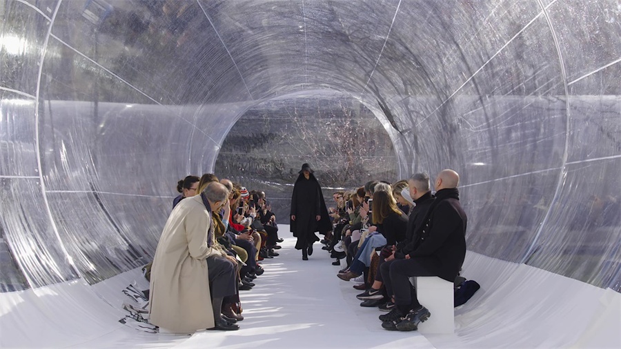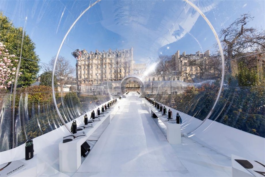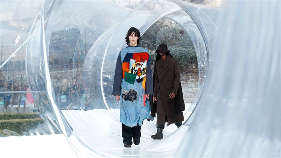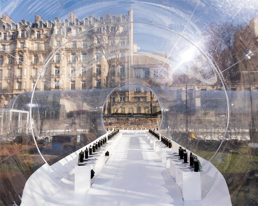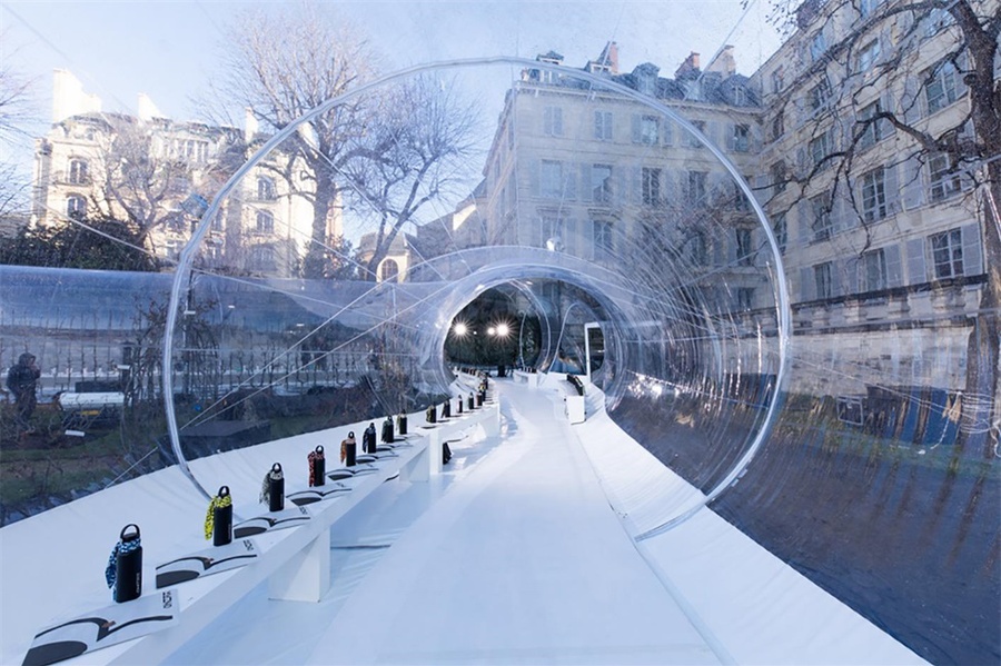 Kenzo(高田贤三)的设计总监费利佩·奥利维拉·巴普蒂斯塔在巴黎国家青年学院的草皮草坪上,架起了一个透明的管状充气结构,并在这里举行了他来到Kenzo后的第一个设计系列的发布——2020秋冬发布会。大型的充气装置将会在Kenzo未来的活动、派对以及广告中反复的使用,这也是活动设计人对环保的贡献。