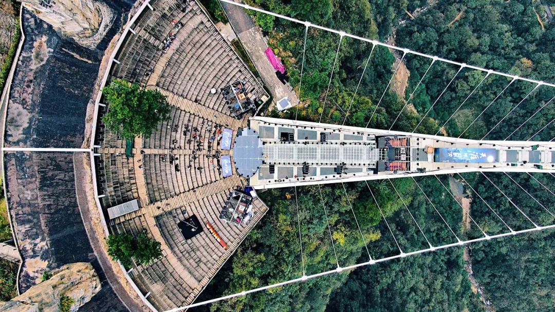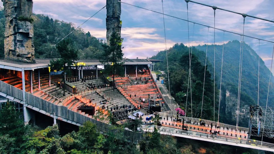 在这座可以同时站立800人的玻璃桥上搭建舞台,创意前所未闻,难度前所未有,毕竟承重有限且安全工作也是一大难关,审批难度可以想象。