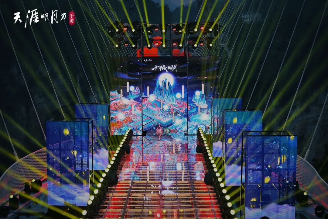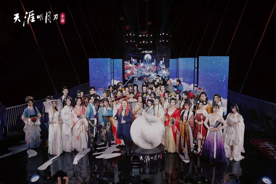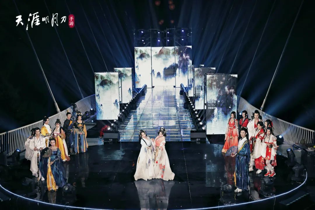 这是《天涯明月刀》手游上线盛典暨张家界战略合作发布会中的主要篇章——《天衣华裳国风大秀》,主办方超乎想象的秀场搬到了张家界大峡谷玻璃桥“云天渡”之上。