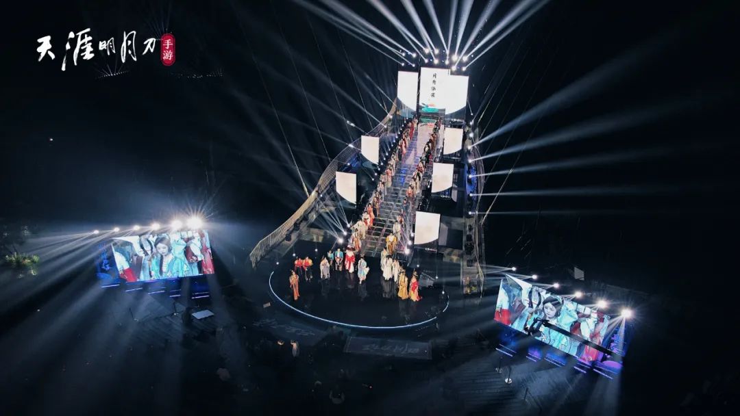 深渊之上,云海之中,大秀开启。由于是玻璃桥面,所以使用了冰屏做视觉呈现,落地效果十分精彩,夜幕之下场面极其震撼。60余名模特带来了近五十套天刀原创的精美华服的展示。既要克服恐高的心理,还要保证高质量的演绎。