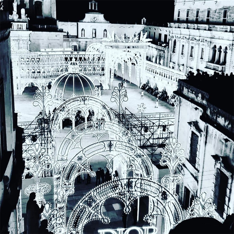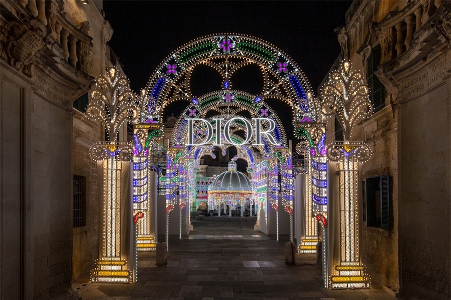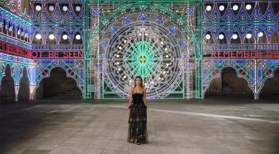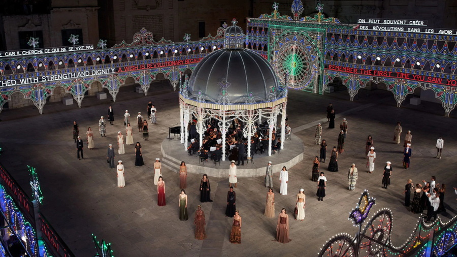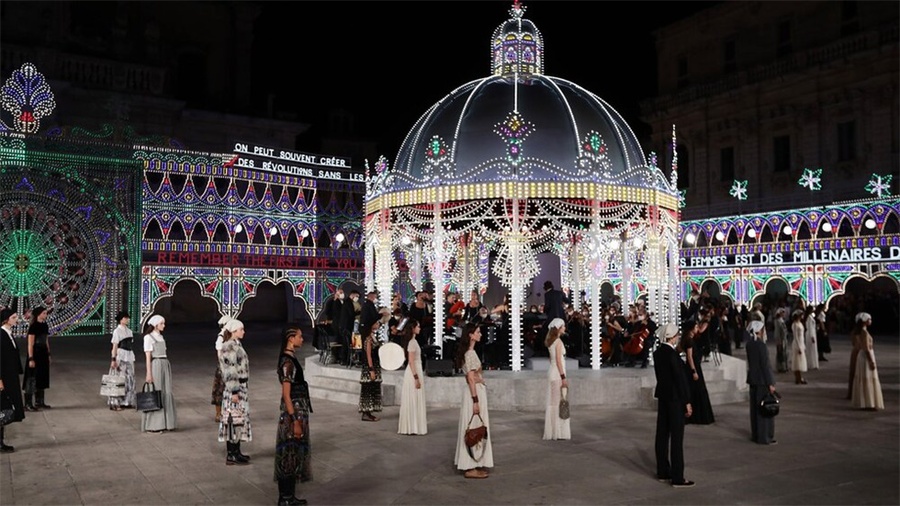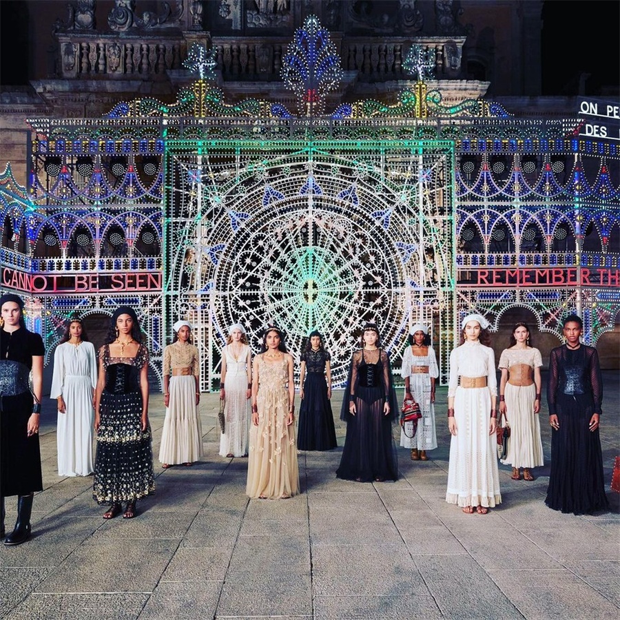 迪奥2021年的巡航系列在意大利莱切市中心的大教堂广场举办了一场令人眼花缭乱的无观众观看的时装秀。模特们严格遵循社交距离进行表演。一个剧场舞台被搭建起来,布景完全采用了意大利当地的纹饰图案装饰了整个现场,向意大利工艺美术致敬。一个完整的、完全戴着口罩的管弦乐队现场演奏,歌手们现场表演,所有这一切都是为了屏幕前的观众,他们在世界各地通过流媒体观看演出。