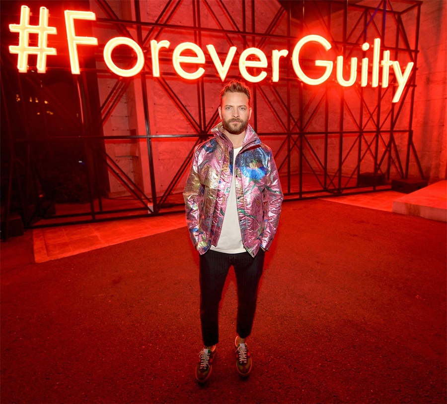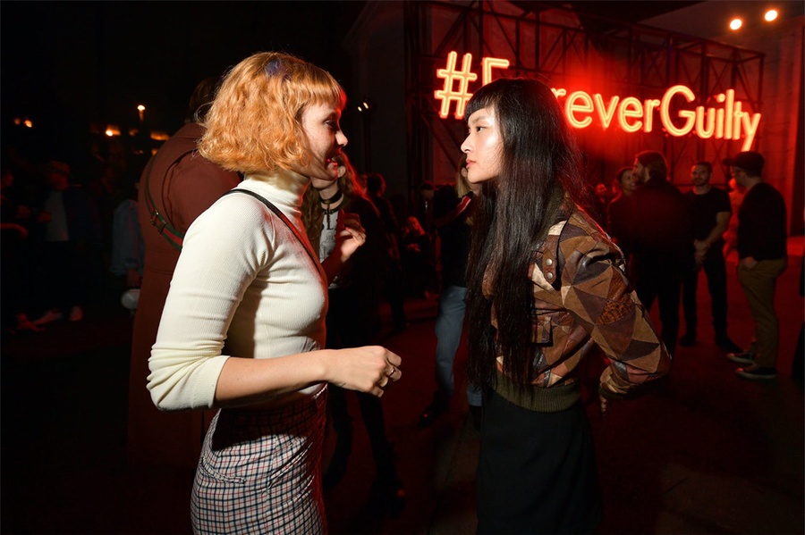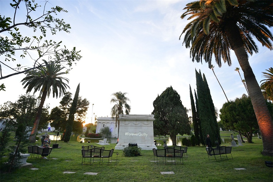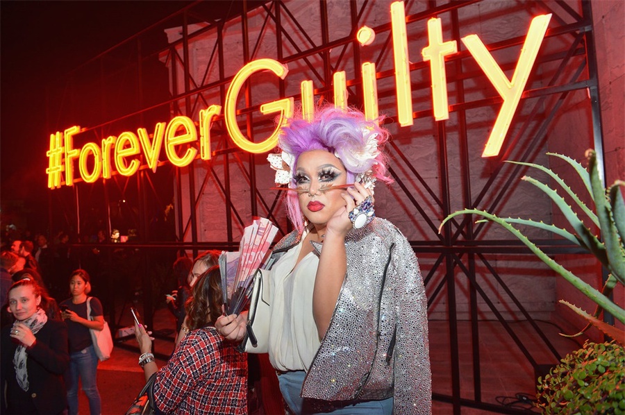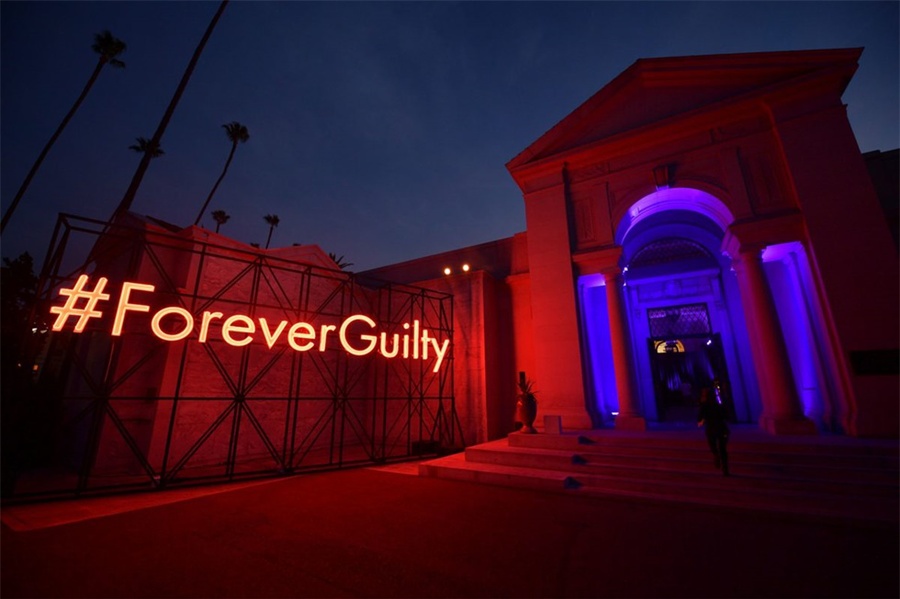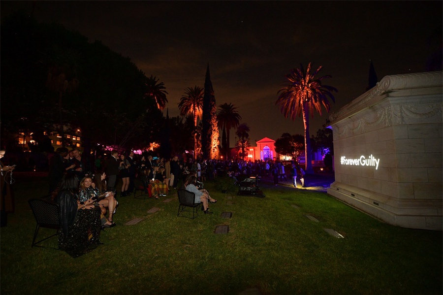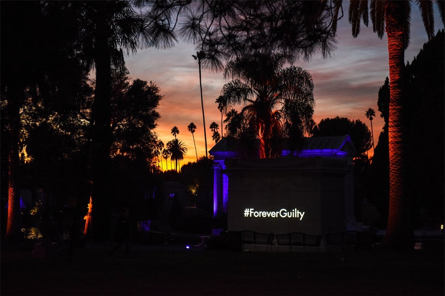 该派对在约翰尼·拉蒙(Johnny Ramone)的坟墓附近的好莱坞大教堂陵墓内及其周围举行,服务员在陵墓外面的银托盘上分发了香槟,伏特加酒和三明治,上面放着一个超大号的霓虹灯#ForeverGuilty霓虹灯作为照相背景。在陵墓内部,展示了新香水,和DJ伴奏的跳舞区。