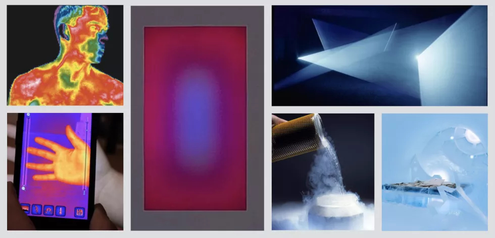 热反应邀请函是传达体温调节思想的第一个“触点”。它被装在保温泡沫袋里放在冰上运输,用热反应油墨印刷,当触摸它时,它会改变颜色。当客人到达会场后,温度调节的图形演示继续进行。客人们首先走进一个像博物馆一样的空间,阅读关于温度调节的知识,并观看变色的光雕塑。在配备了热成像相机的“热视觉走廊”,客人们可以看到自己的热成像剪影。