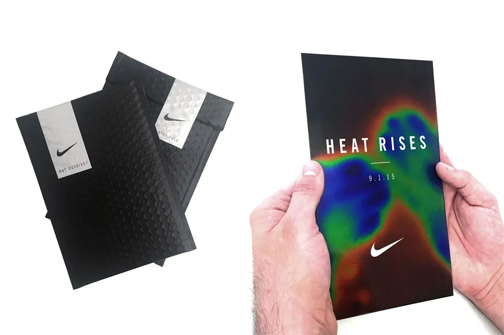 受邀请的媒体收到了一份由品牌大使亲手递交的热调节请柬,在被送达前请柬一直放在冰上。邀请函被涂上了一层热敏感油墨,冷的时候是完全黑色的,但是当触摸时,会变成红色、蓝色、绿色和黄色,以显示人类手掌中的温度特性。在送出邀请函前会要求受邀人确定他们的具体位置和确切的送达时间。
