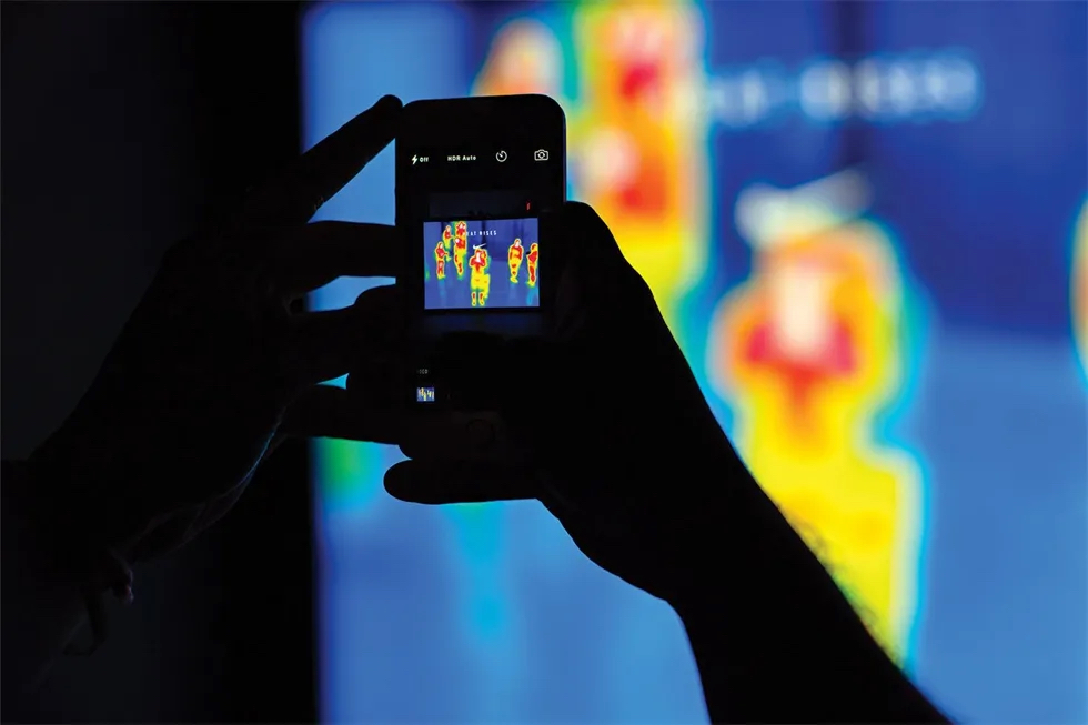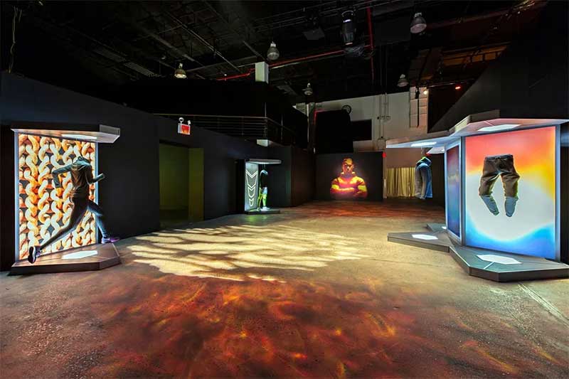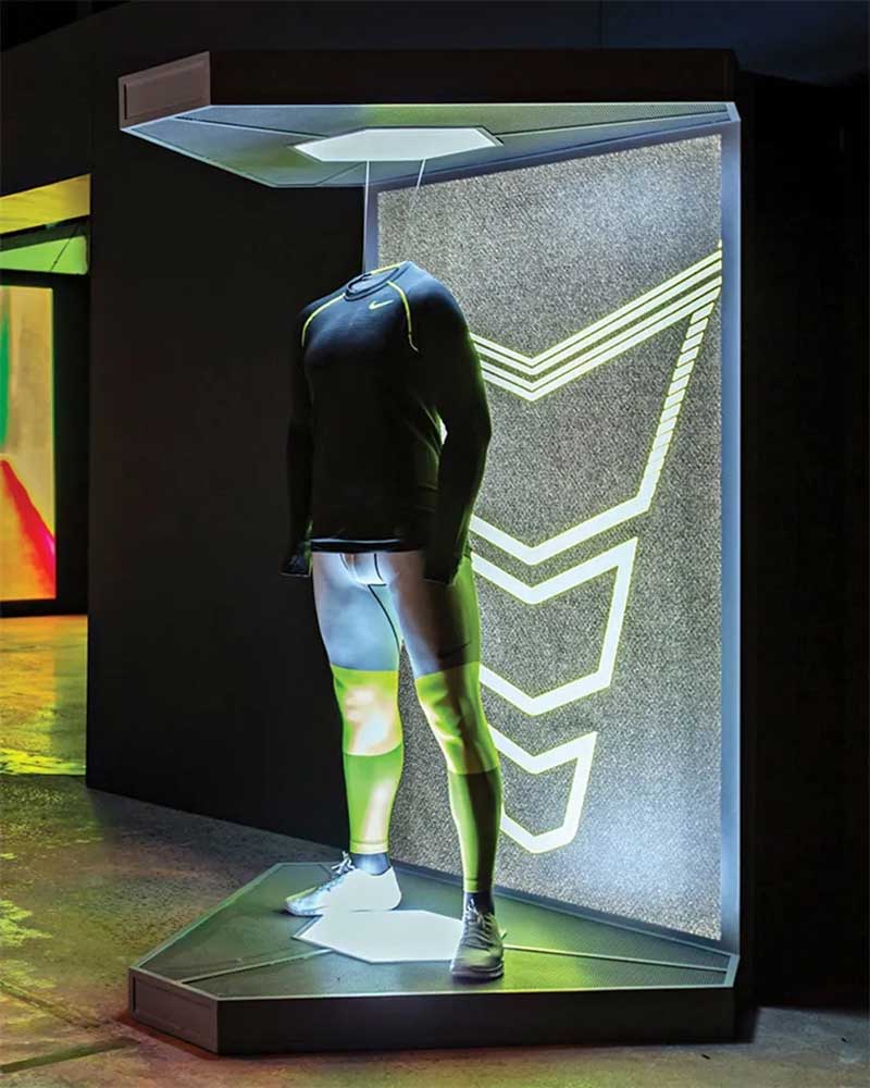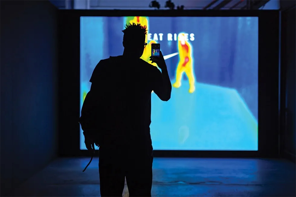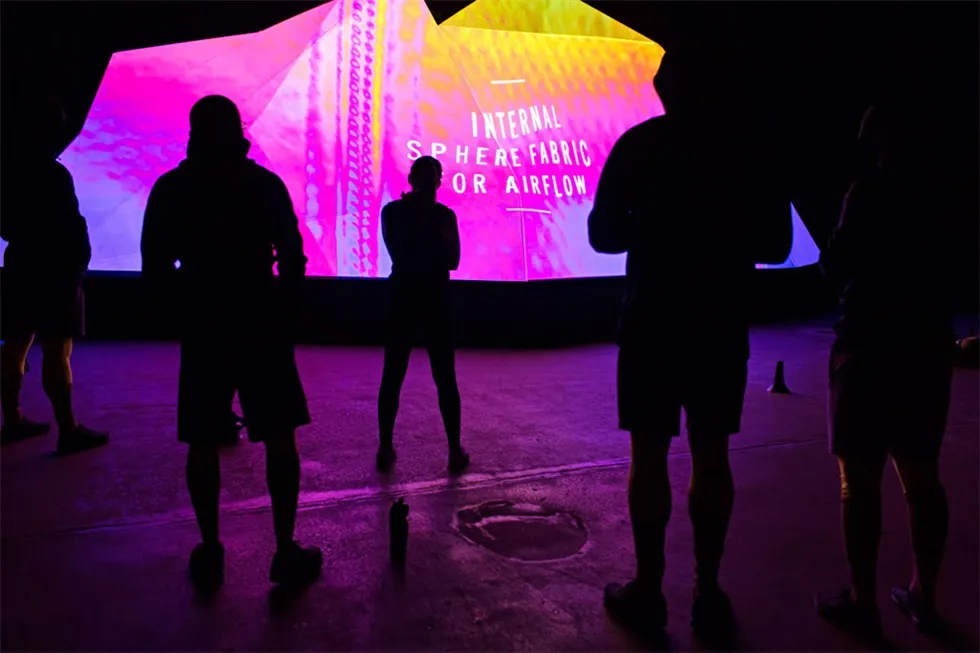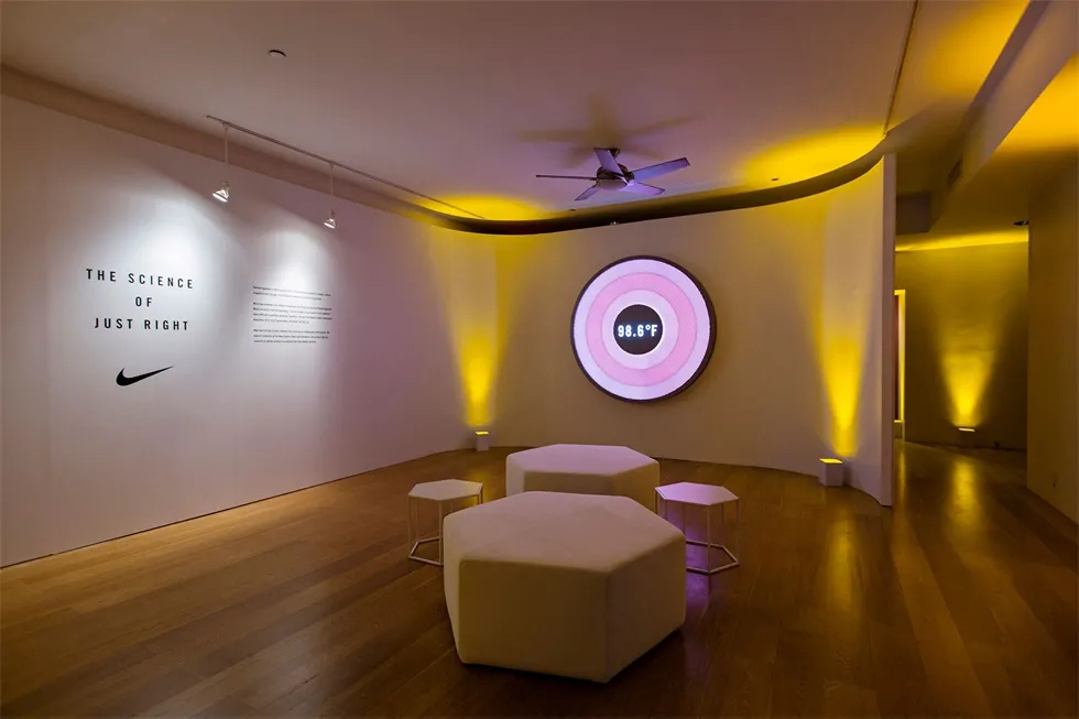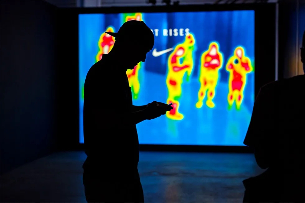 活动现场体验始于温度调节画廊,在那里,客人会了解到温度调节的科学和耐克的解决方案。之后,他们可以用热成像相机拍摄自己的热视觉轮廓。接下来是雾气,光线等多种感官元素激活的产品展示和演示,而背景声是由耐克应用服装研究总监巴里·斯皮尔预先录制的画外音。