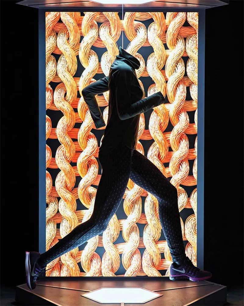 换上新的运动服后,客人们进入了0度寒冷天气下的健身房。采用工业冷却系统和丝绒面料吊顶阻隔了冷气的外漏,将室内温度降至冰点以下,以展示产品的调温性能。为了进一步表达寒冷天气的信息,设计了一个类似冰川的三维表面和投影映射动画与现场的运动同步。这些动画视频有阿尔卑斯山和冬季图像与程式化的效果视频以及经过编辑的耐克的镜头。