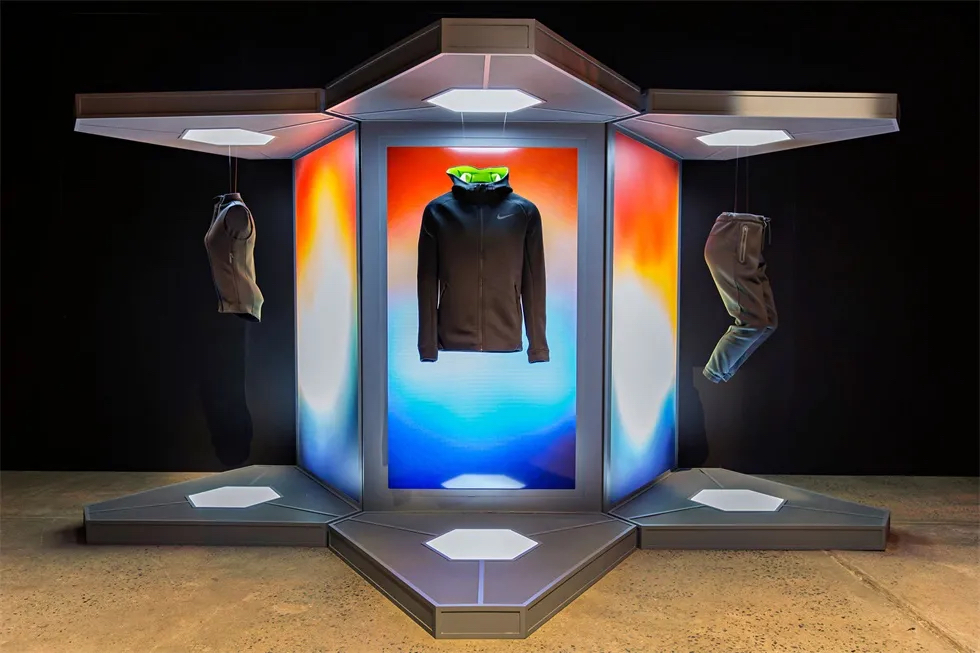 由于面料全能的几何结构,六边形构成了Therma-Sphere Max训练服面料的创新点。这种形状也是冰分子的基础。产品展示设计时,使用改进的六边形作为整体的框架,在不同的产品展示中实现统一性。为了表达透气性这一关键特征,产品展示采用穿孔金属板作为主要材料。