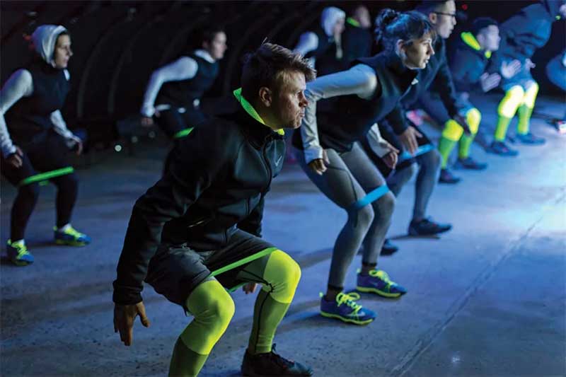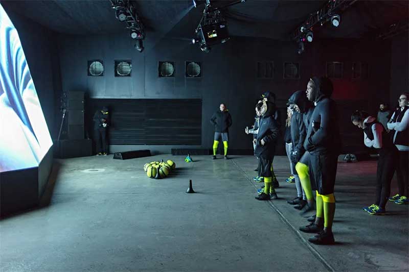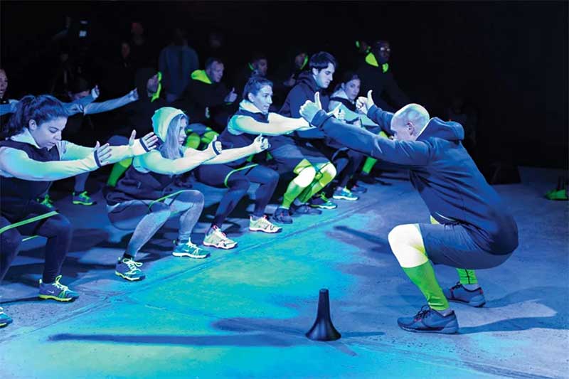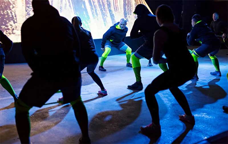 虽然与会者被告知体验将包括锻炼,但他们没有被告知是在一个摄氏0度的房间里锻炼。在在更衣室里,参加者穿上了事先标上名字的耐克的装备,与耐克总教练弗兰克·多兰一起进行30分钟的高强度训练。为了增加这个0度健身空间的视觉维度,活动策划人特别设计了是一个3米高、10米宽的立体冰川装置,运用投影映射将冬季寒冷天气的视频图像投射到其表面。随着参与者的锻炼活动,这些图像会不断改变以反应参与者的身体变化。