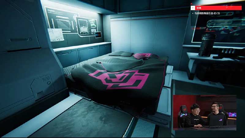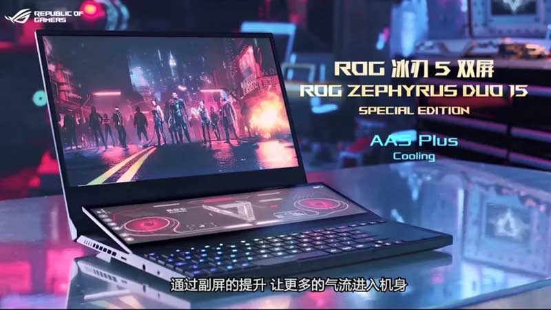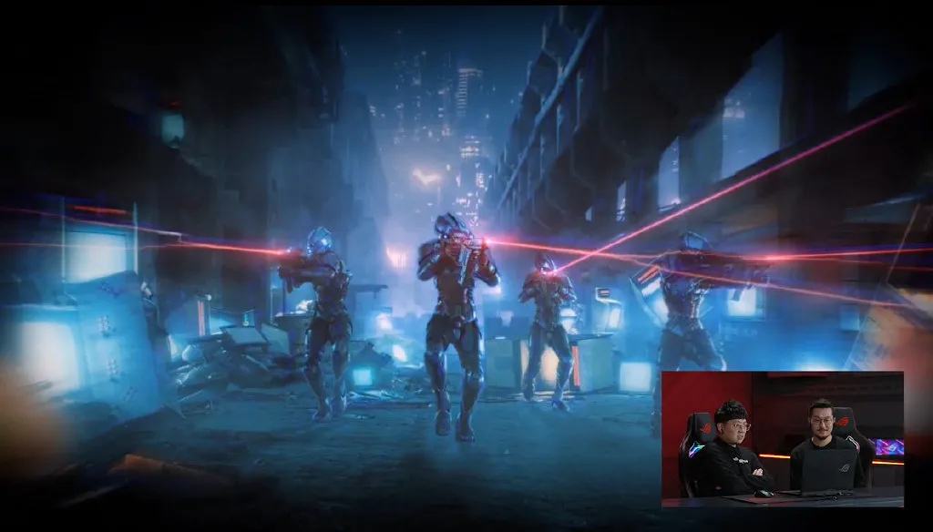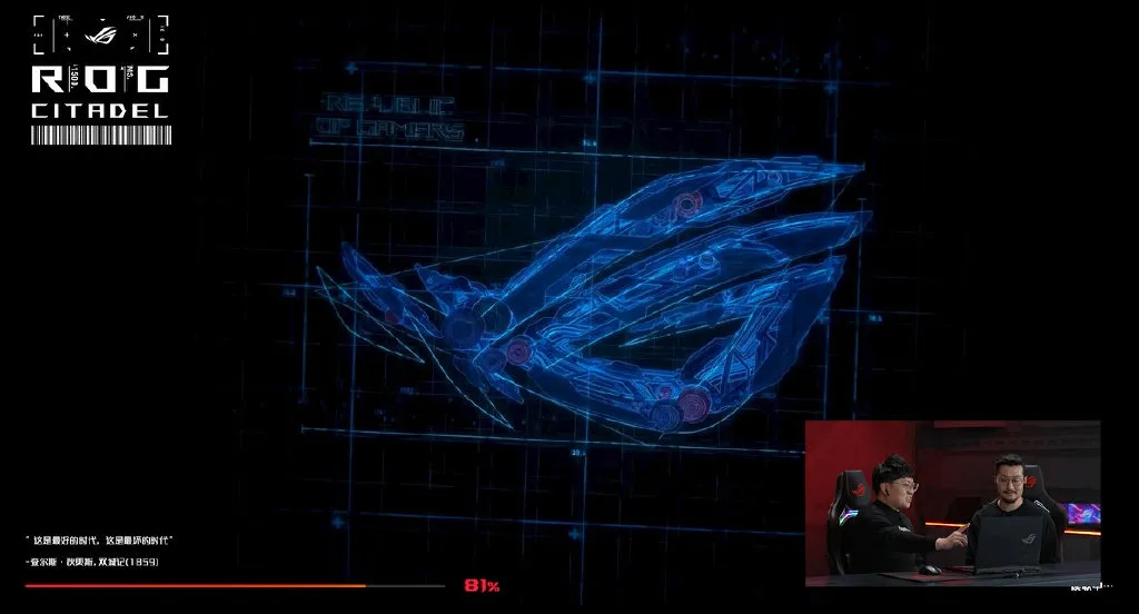 发布会开始前,一个身着黑衣连帽衫的背影,穿行在都市夜色之中,全程没有回头没有露脸,仿佛是每一个玩家的化身,一直走到发布会现场,营造了悬念十足的神秘感。发布会的开篇是主持人WAWA和华硕电脑开放平台中国区总经理俞元麟的互动,以游戏直播式的对话去开箱体验新产品,两个人从一款名为《ROG Citadel XV》的游戏的试玩开始,通过虚拟空间全方位的秀了一把科技,而游戏里随处都有品牌logo等设计元素以及系列产品的展示露出。而产品的介绍画面,是分开录制的,鼠标点击笔记本的任一部位都有不同的动画效果呈现。