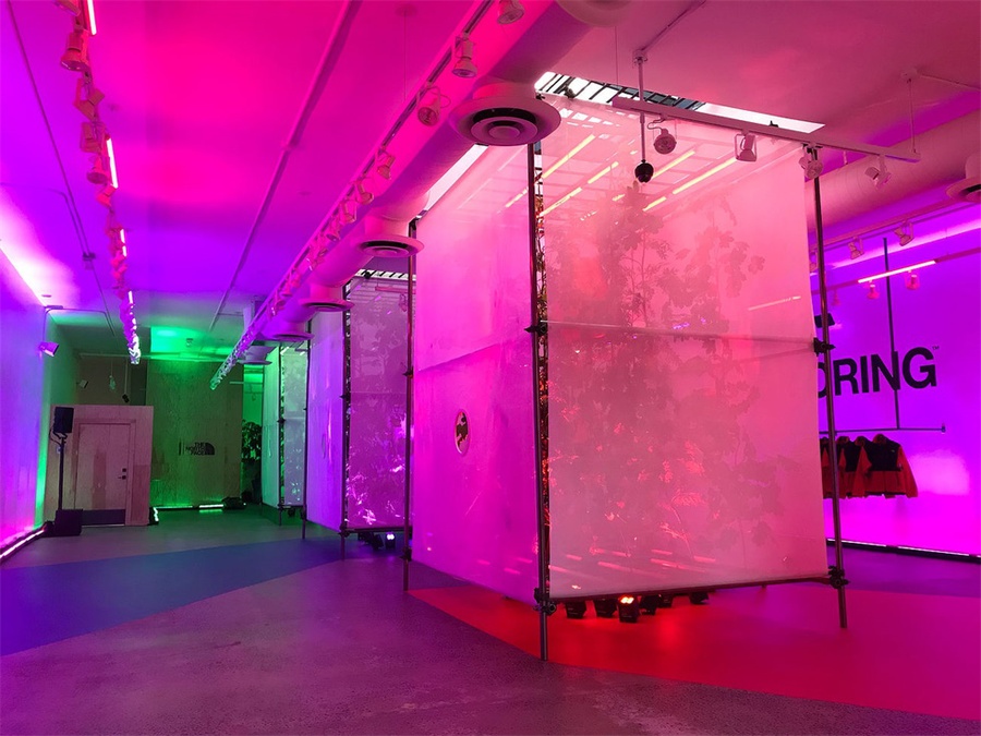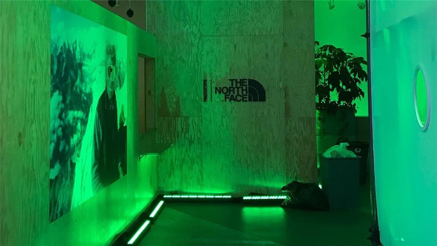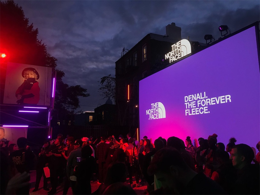 发布会在布鲁克林威廉斯堡的示范店举行,为了发布会活动整个商店的所有东西都被搬走,在商店里摆上了新的抓绒衣,商店的外面是主要的活动发生地,是整个活动的核心区。现场的灯光照明是这个活动的一个突出的焦点,现场使用了LED像素管、吊杆灯、向上的照明灯和移动灯具等各种灯光设备。商店内部还设置了不同区域的灯光,以配合展示新的产品。