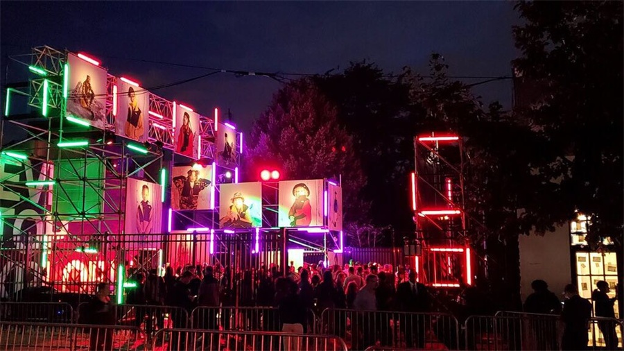 商店的外部区域,在脚手架上安装了巨大的屏幕,投射出不断循环的视频内容。LED像素管被安装到脚手架上,提供持久的染色效果,灯光与活动相呼应,红色、蓝色和绿色成为了现场主色调。DJ组合Nina Sky在舞台上拉开了派对的序幕,给观众们带来了一种终极的音乐氛围。