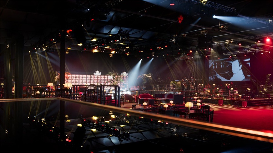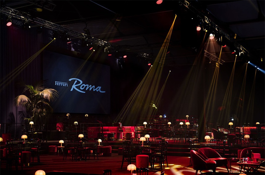 新法拉利罗马发布会概念探索“甜蜜新生活”是一个非常独特的体验。首先客人光临的是一个现代俱乐部空间,其设计灵感来自20世纪50年代的优雅,12米长的酒吧,周围是多层的天鹅绒装饰的休息室。中央舞台融合了一种诗意的、瞬息即逝的投影背景,舞台上方是一个八边形LED屏幕,新的法拉利罗马在嘉宾中。