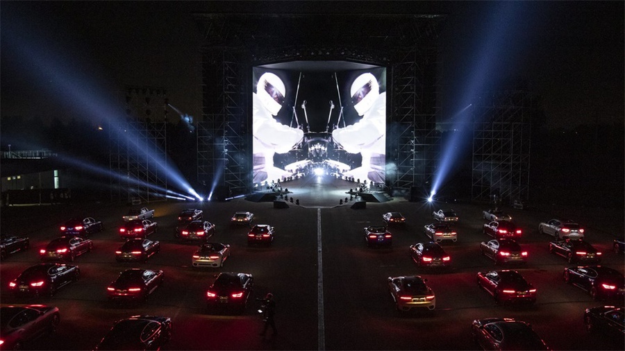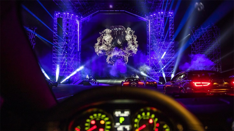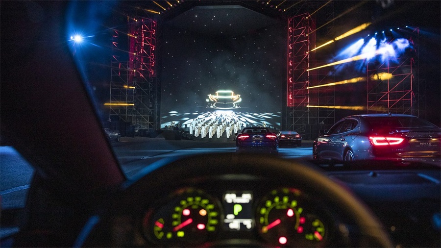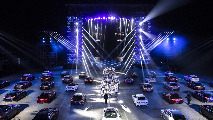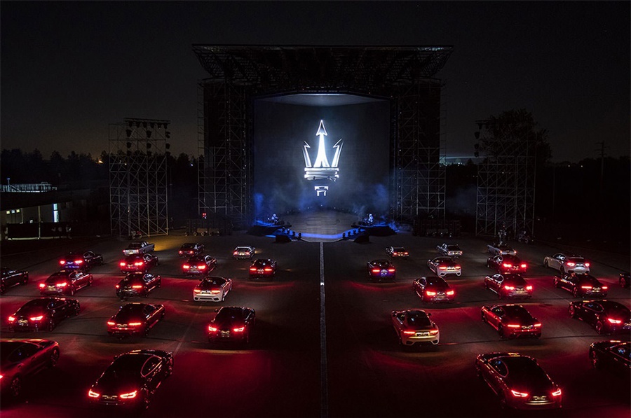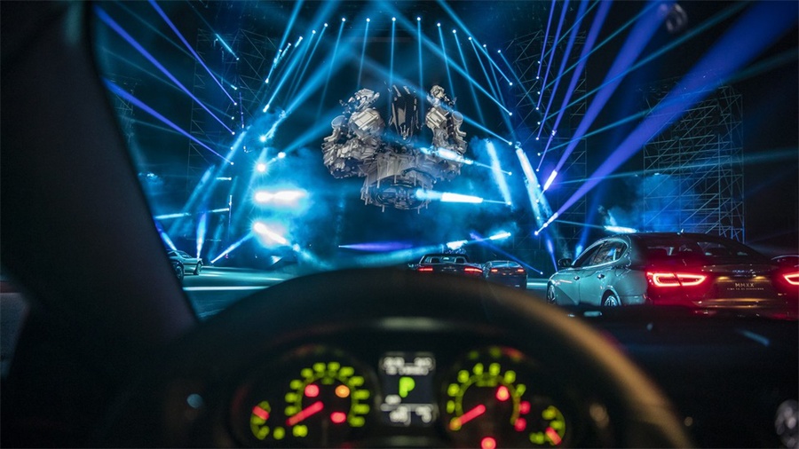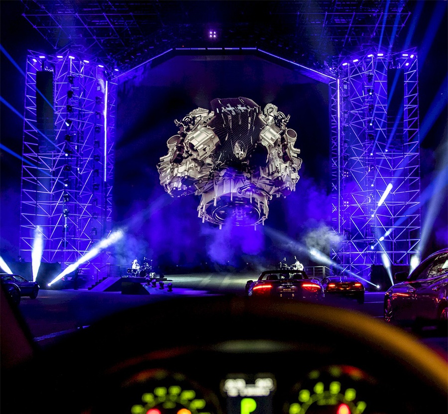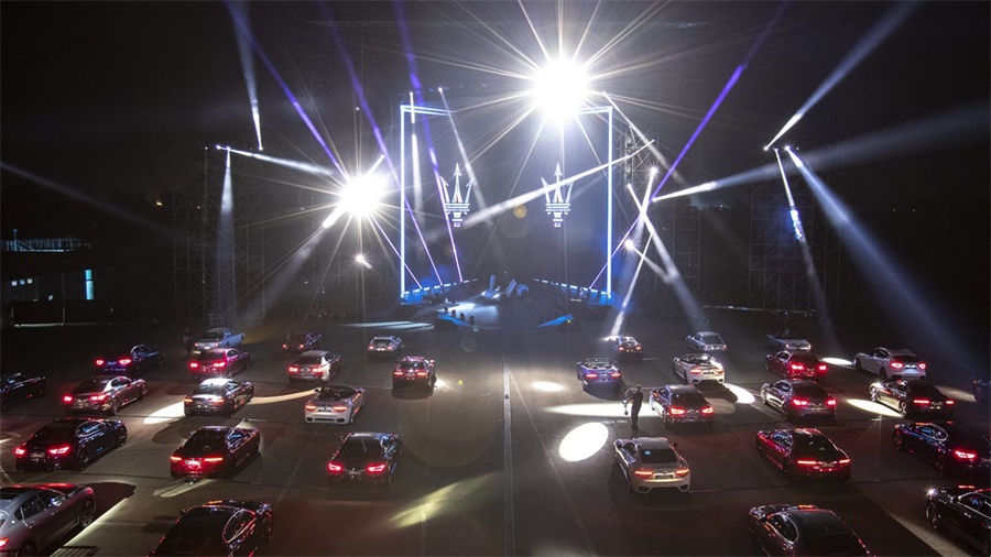 一个巨大的舞台,一个巨大的LED屏幕,来自各个时期的44辆玛莎拉蒂轿车被放置在放射状的布局中,创造了一个令人回味的汽车影院环境,并有限地容纳了一小部分观众。而它们身后,更多的贵宾和记者们则按照现行的安全距离坐在看台上,这种声音(也是视觉上的)基于对该品牌独特吼声的诠释,与一颗新的心脏的跳动作比较: NETTUNO引擎的轰鸣声,点燃了表演,重新唤醒了玛莎拉蒂的精神。