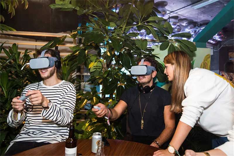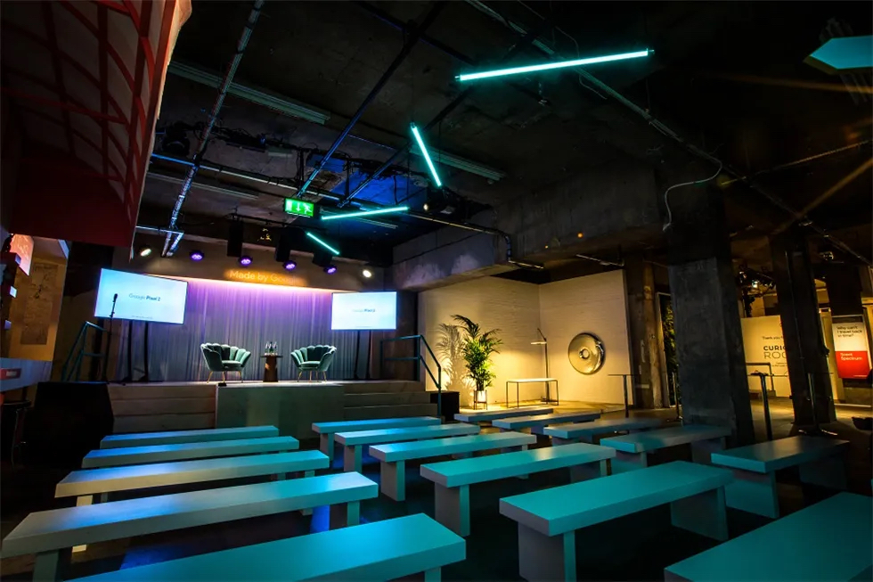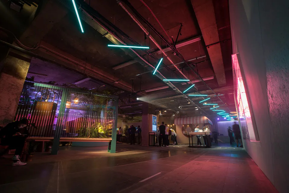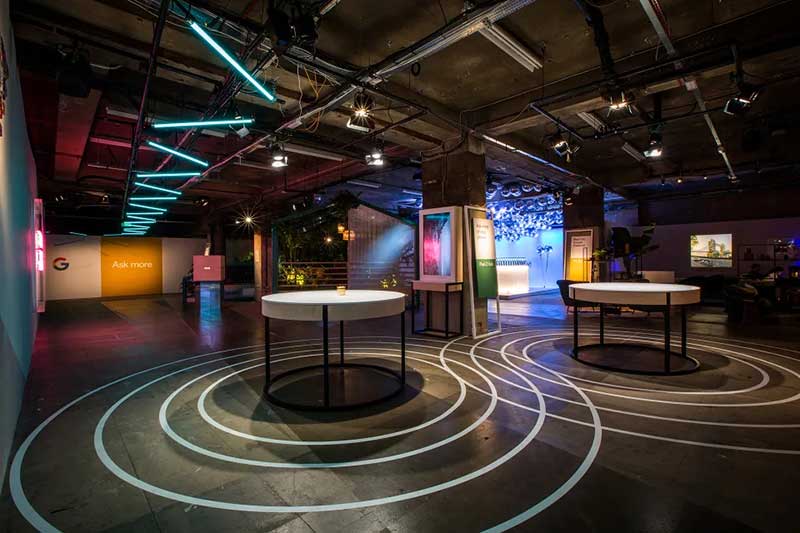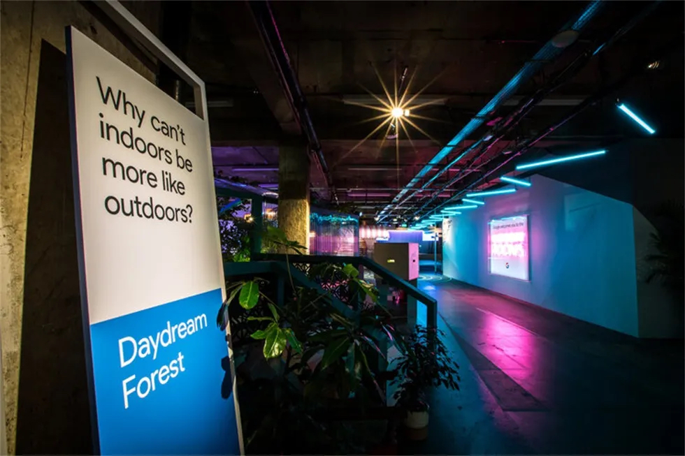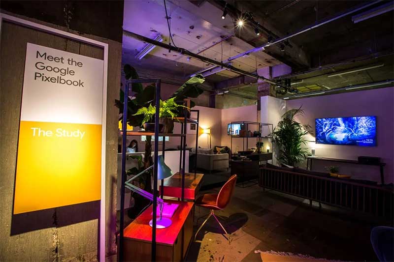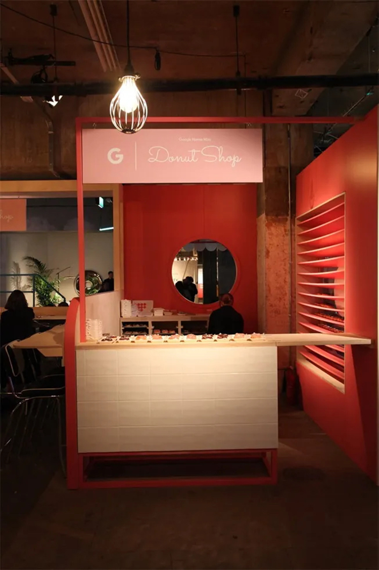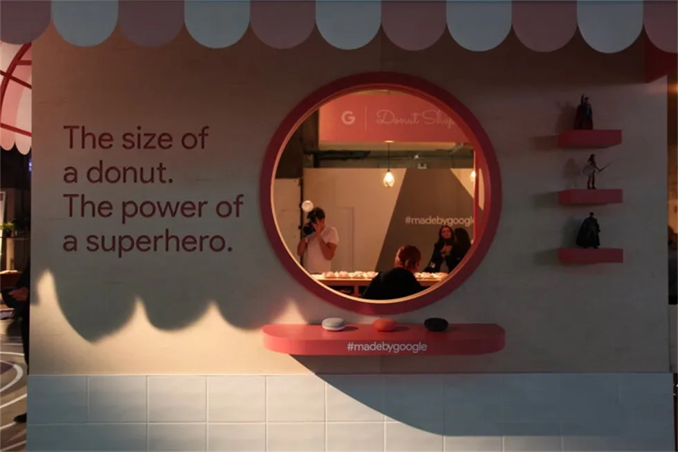 “动物工作室”的体验鼓励客人们做一个小测试,以找出他们内心的动物是什么,然后再和一个风格独特的(粉红色的)动物模型摆姿势。他们也收到了相应的刺绣作品。在“气味光谱”中,客人们通过闻一系列没有标记的气味来体验时间之旅,看看会让他们想起什么,想起哪里。然后,他们可以将自己挑选的香味混合起来,创造出一种独特的、个性化的香味。在“白日梦森林”中,客人们通过谷歌的“白日梦”虚拟现实头盔进入不同的世界。在“像素人像”项目中,客人们用一系列像素手机拍摄照片,然后制作GIF动图。然后,他们可以通过社交媒体渠道来分享自己独特的动图。在“谷歌家庭迷你甜甜圈店”,客人可以用美味的甜甜圈给自己充电,也可以给手机充电。《怪奇物语》增强现实休息区客人使用像素手机,可以在空间中“看到”他们最喜欢的《怪奇物语》角色。最后,这里还有一个“自习区”供客人亲手使用谷歌的系列硬件产品。
