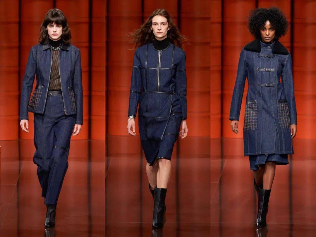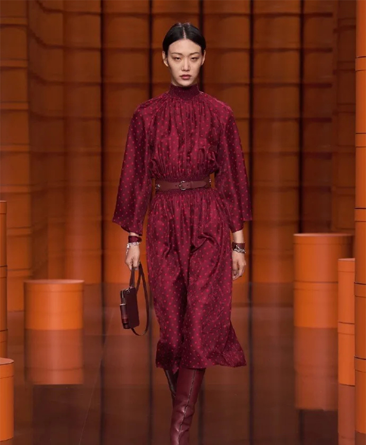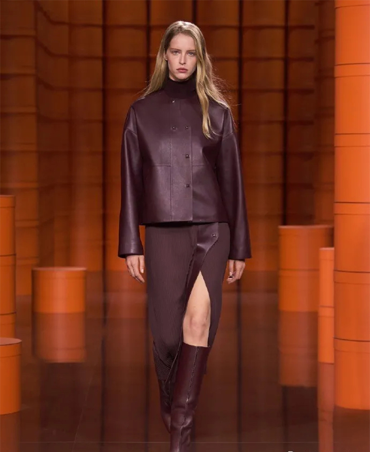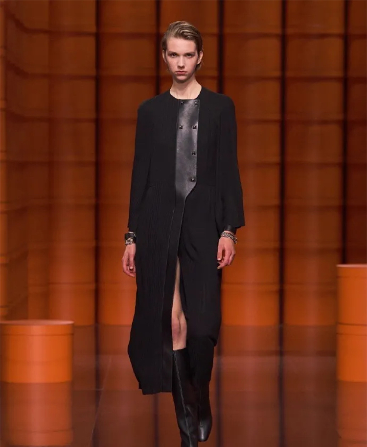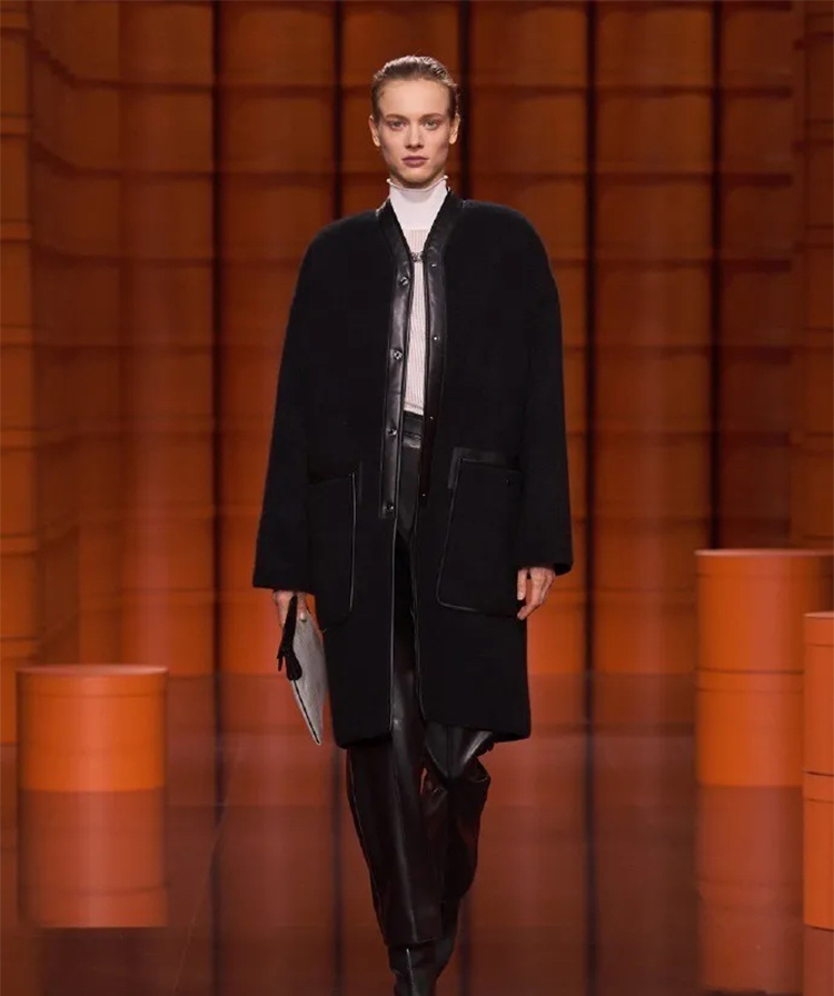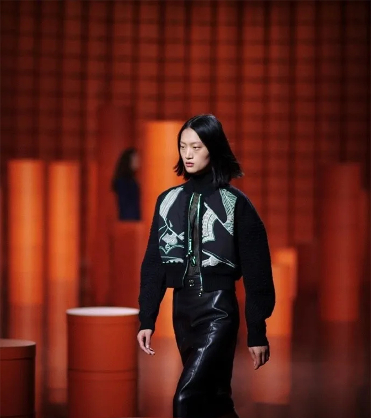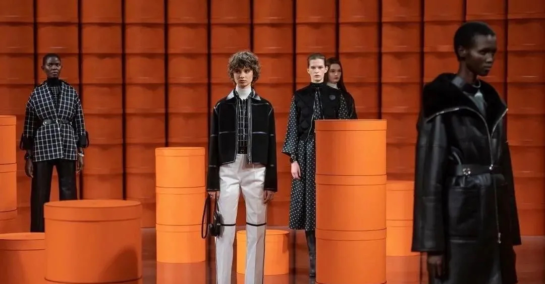 爱马仕经典的橙色盒子遍布秀场,高高低低礼物盒堆仿佛悦动的音乐旋律,模特们身着着最新一季的时装穿梭在爱马仕橙的世界中,凌厉有型。