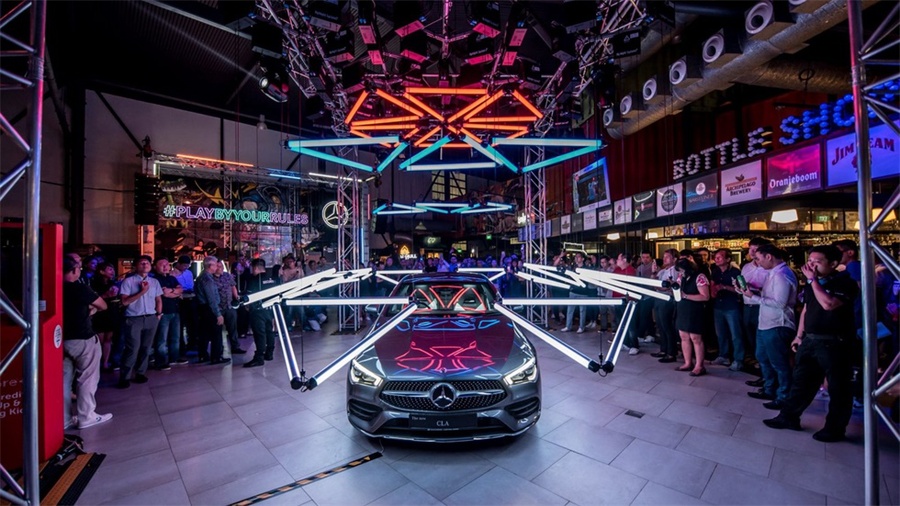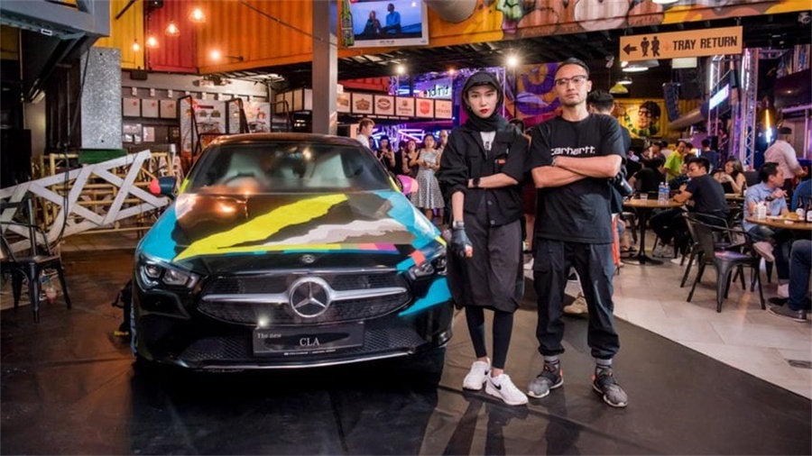 在正式发布过程中,焦点是一个动态灯光装置,它会在新车顶上“跳舞”。街头艺术家直接在乙烯基(PVC)包裹的汽车上进行涂鸦喷涂,来增强奔驰CLA“我行我素”的产品性格。