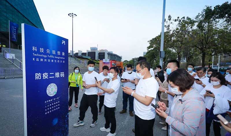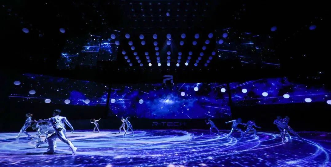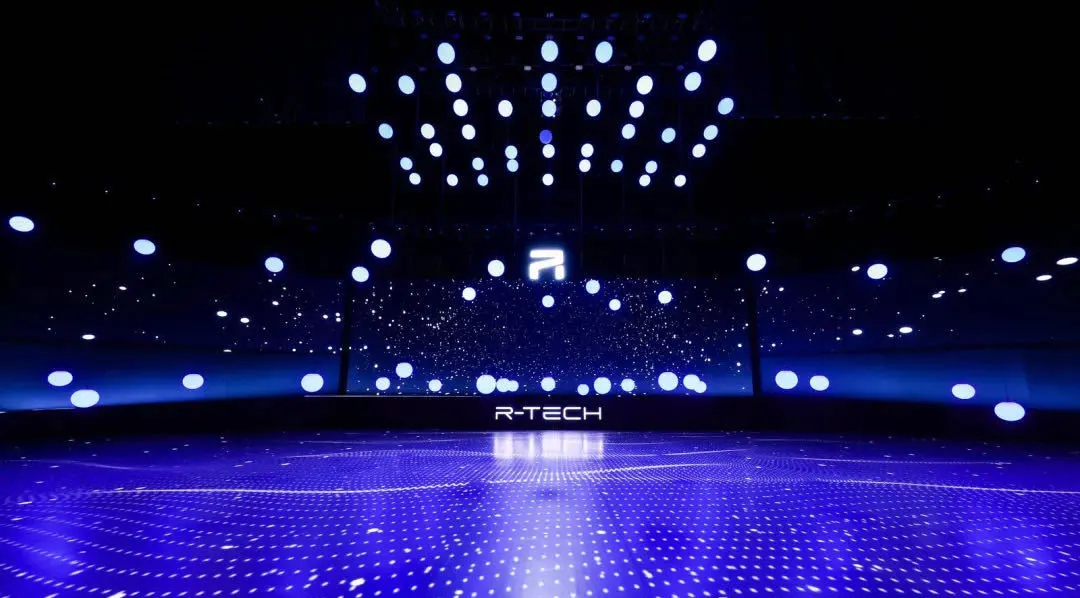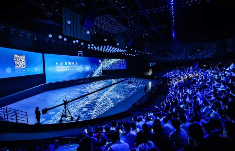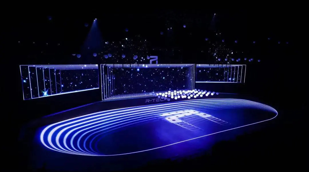 本次“R品牌共创者生态大会”以“蓝”为主色调,凸显科技与智能,符合本次产品定义,同时搭配白色与之呼应,让整场感觉更协调统一,让科技的力量更具柔和的人文关怀。从外场的签到处白色发光定制签到台到整个序厅LED屏幕与场地完美结合的运用,加上序厅R系列的Slogan和标识的投射运用,更加体现了科技感与智能化。