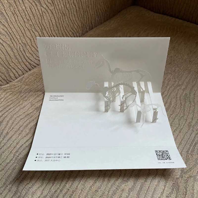 本次R品牌邀请函极具特点,在视觉与触感上做到了极致。当你收到邀请函时,你会看到一个来自R品牌所便抛出的问题:“万物进化,都藏着怎样的秘密?”当你翻开邀请函后,两副来自遥远时空的立体恐龙骨架便跃然眼前,“从骨骼探寻历史的脉络,以遗迹推测未来的奥秘,让科技真正实现人类所憧憬的美好生活”,这便是R品牌所给出的答案。