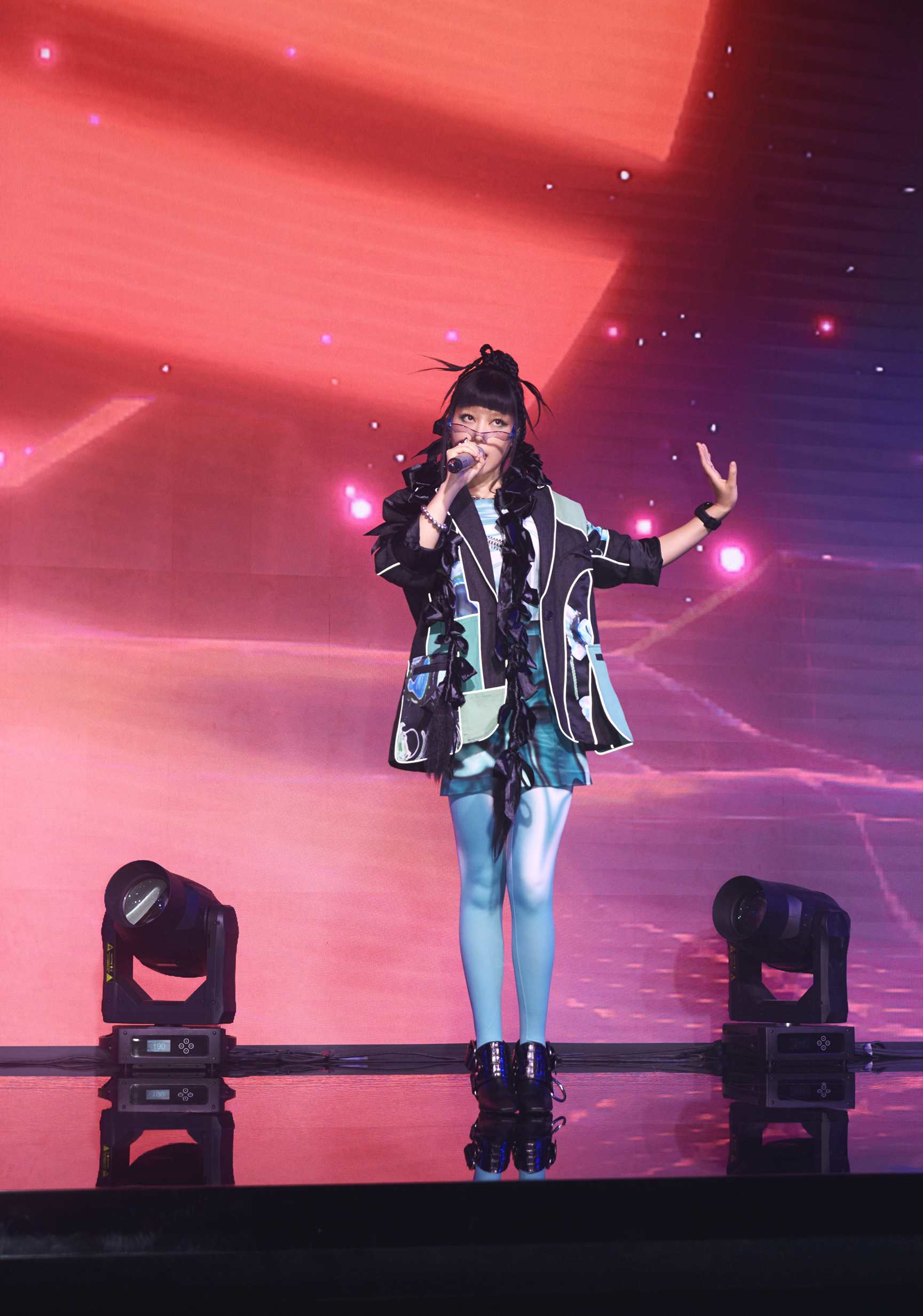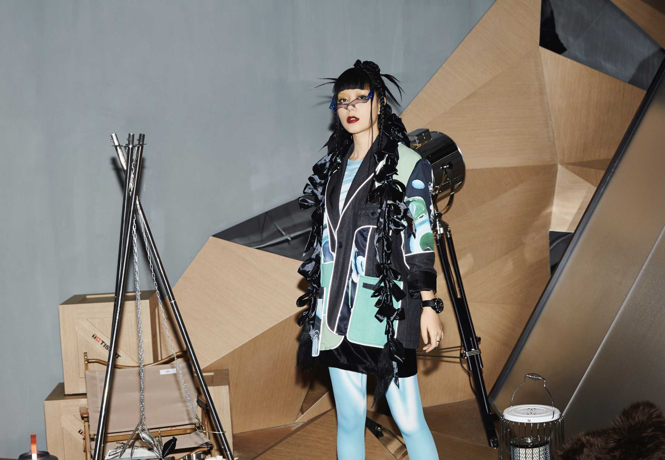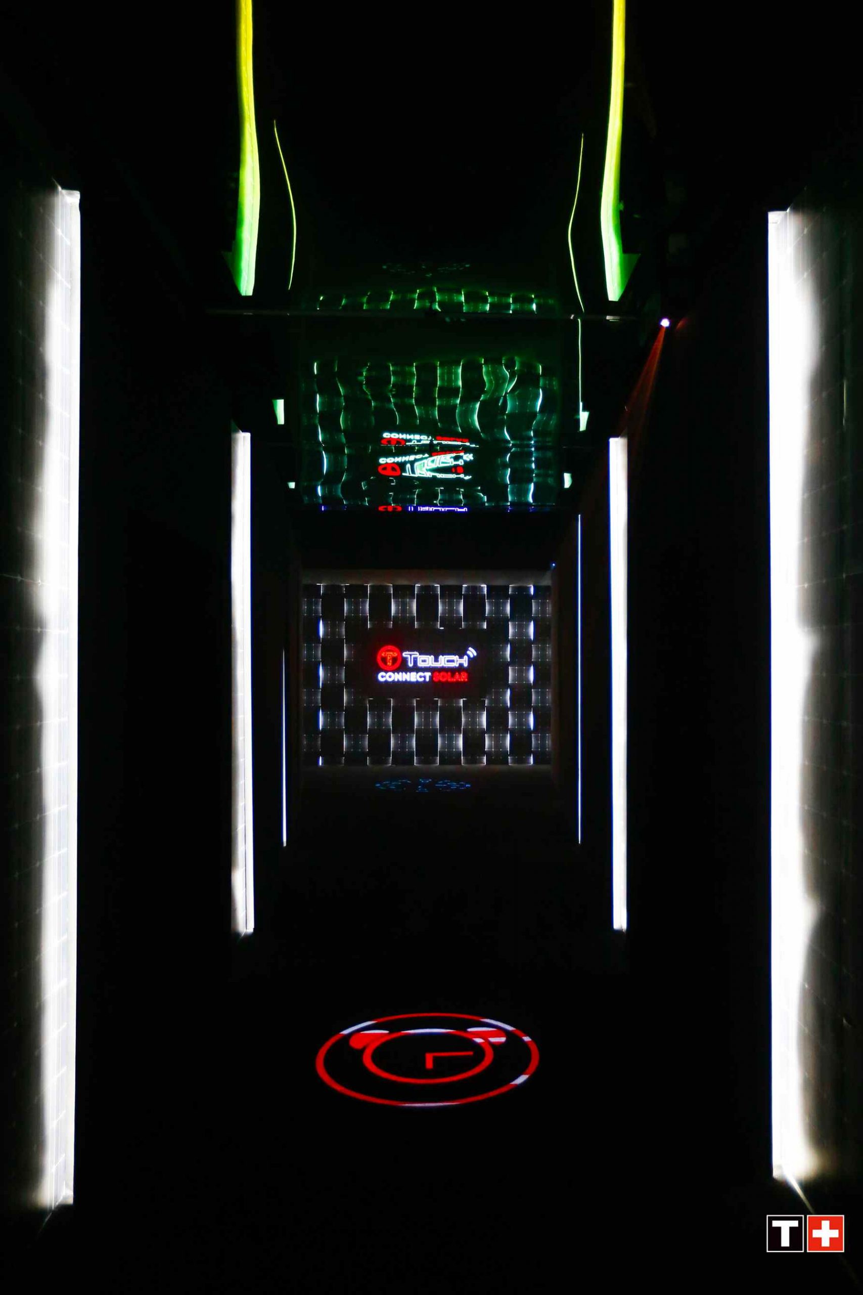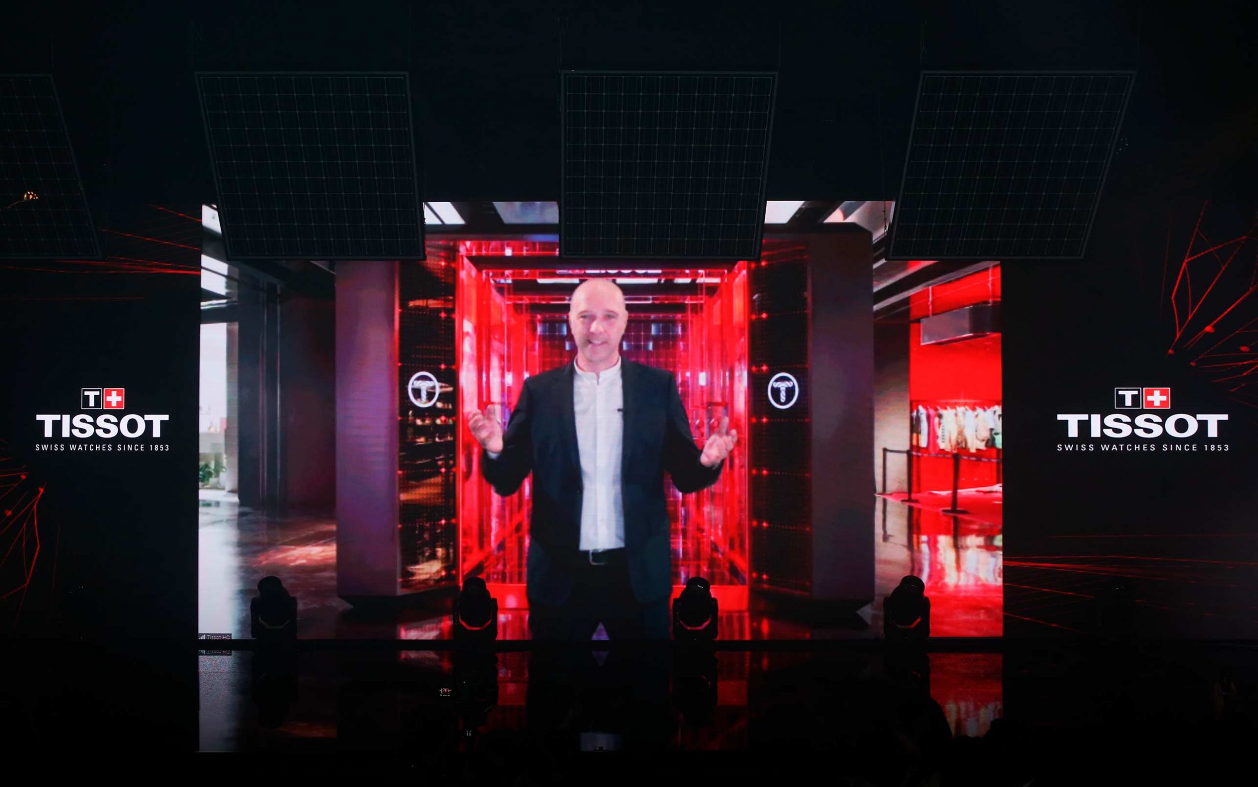 发布会现场打造成一个城市与自然结合的艺术空间,混凝土立柱和水泥墙面,与炫酷的灯光交织,再融入生机盎然的绿意,营造出对自然的无限好奇与探索的氛围。黑镜玻璃上用灯带勾勒出的品牌logo“T”“+”形状,镜面与光之线条呼应,传达着天梭对创新技术和摩登风尚的全新探索。以太阳能板材质打造墙面的隧道,连通天梭在钢筋水泥城市中打造的一隅绿洲与畅快拥抱自然的户外野营氛围主舞台空间,激光于座位区域映射出一座座立体帐篷,仿佛凭空构建出的独立空间,令来宾身临其境,无界胜有界。