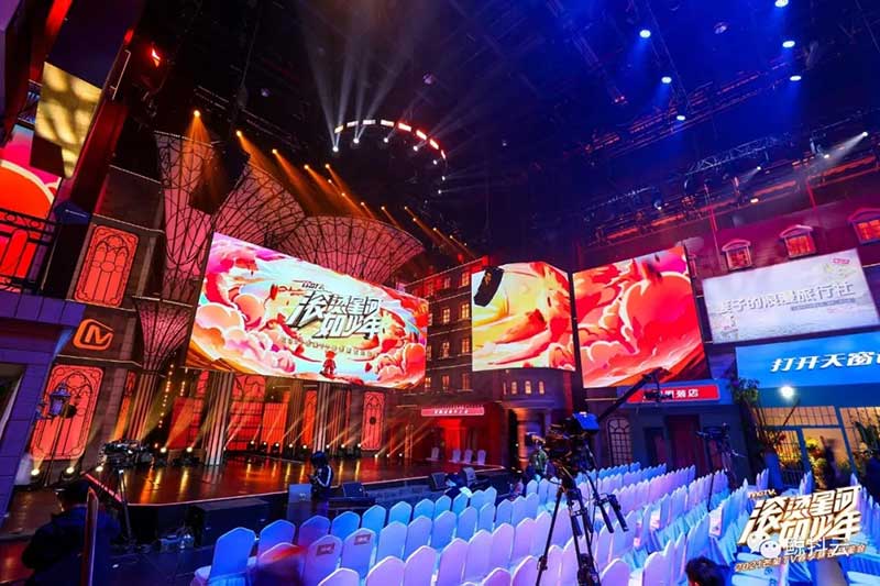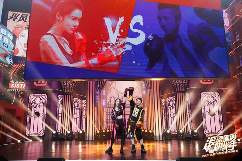 会场内最夺人眼球的便是舞台的精美设计,足以说明“以小见真章”的真正含义:悬空的巨幕垂直于舞台,高耸的设计拉长了舞台纵向视觉比,而大小不一的小屏于舞台两侧参差排列,错落悬挂,不仅拉长了会场的横向比例,更能让观众视野丰富多彩,像极了中央舞台所展开的机械羽翼,沉浸式地感受立体视听效果。