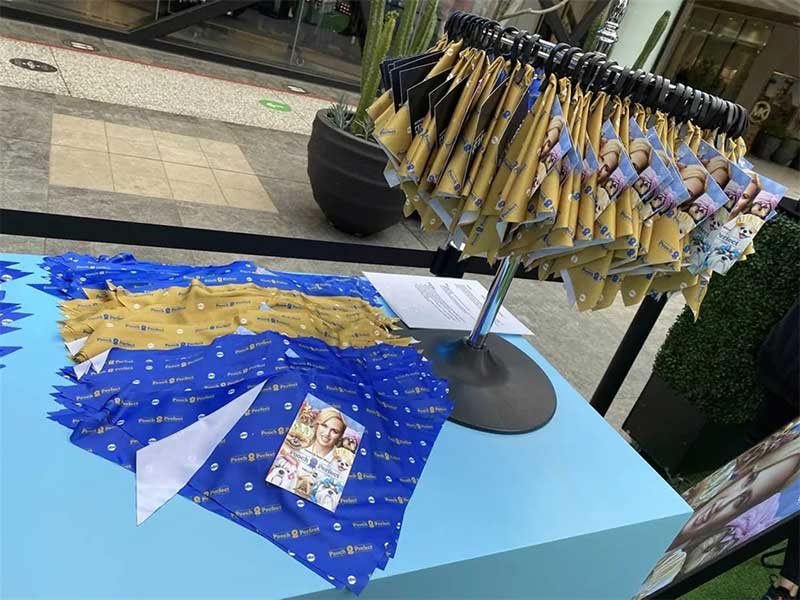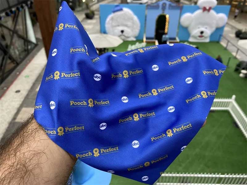 在活动现场,还散落着宣传《完美狗狗》节目的标牌,另一个看起来像宠物食物碗的道具也是为客人们准备的拍照道具。现场的一张桌子上摆放着印有节目名字的小头巾,欢迎客人带回家给自己的宠物朋友。