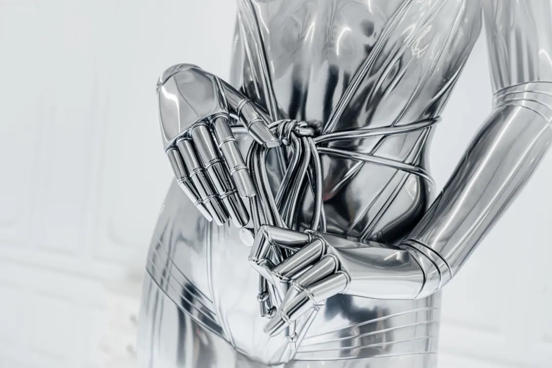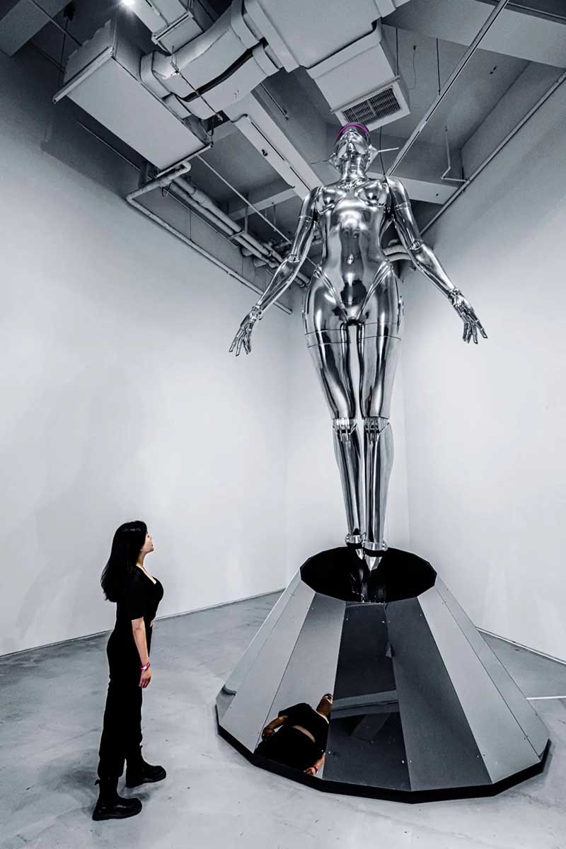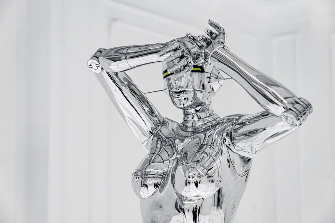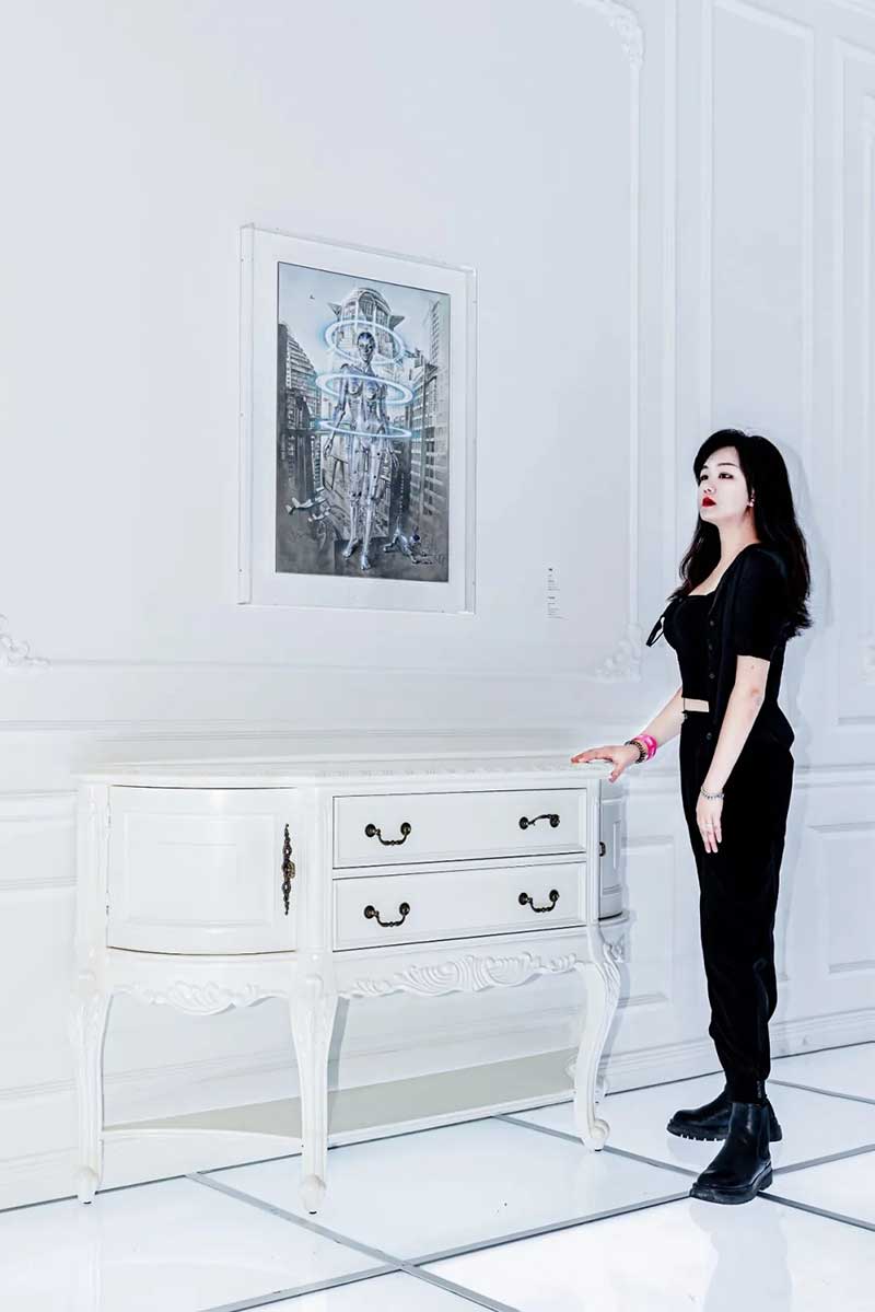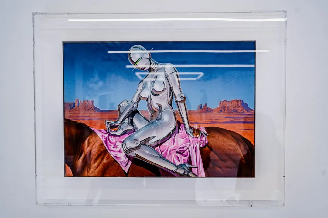 除了各种机械姬雕塑作品以外,展厅里的各种画作也极具设计感,机械姬的超现实主义美感被展现地淋漓尽致。冰冷僵硬的金属仿佛很难与性感妩媚相结合,但这幅以玛丽莲·梦露经典造型创作的机械姬,梦露的曼妙曲线加入机械元素,营造出别样的美感,还曾被殿堂级乐队AEROSMITH用作专辑封面。在展厅的后方黑色帘幕背后,隐藏着一处神秘空间,黑白光影打造出沉浸式的科幻感,是这次展览不能错过的打卡点。数座悬浮机械姬,构成了一幅宏大的画面,在白色灯光的照射下,用黑色幕布衬托出满满未来空间感,视觉冲击效果超强。在这座镜面迷宫中,你会不知道哪条路通向前方,也不知道哪座机械姬是真实的,或者哪些是幻影。能做的只有用心去感受这神奇的空间。