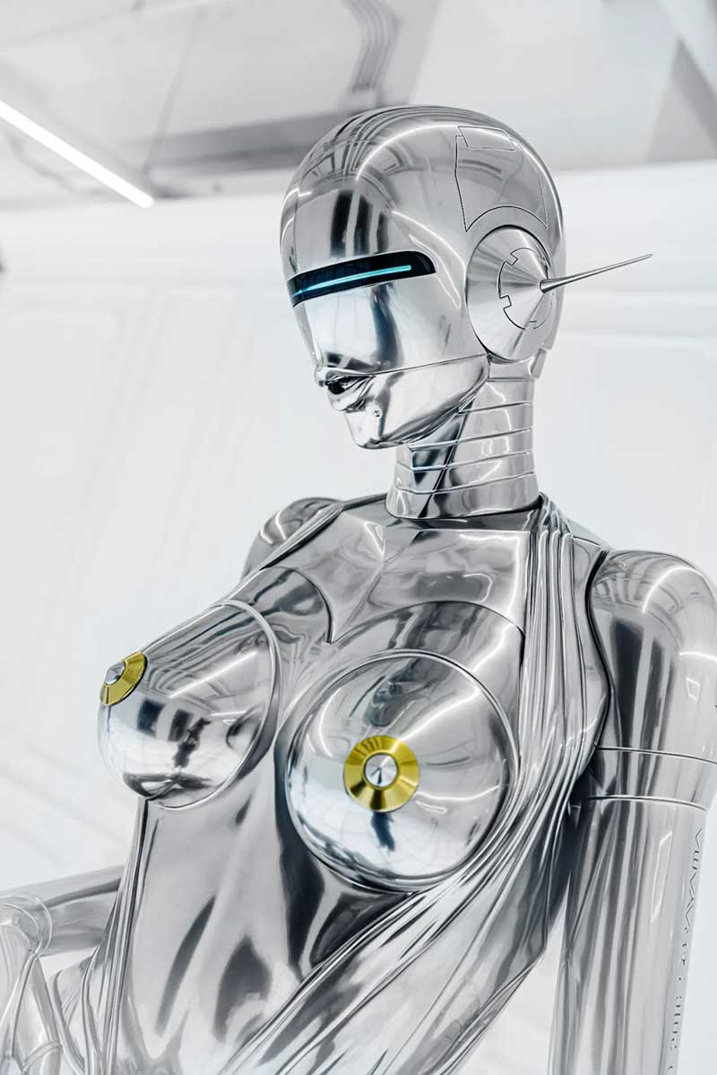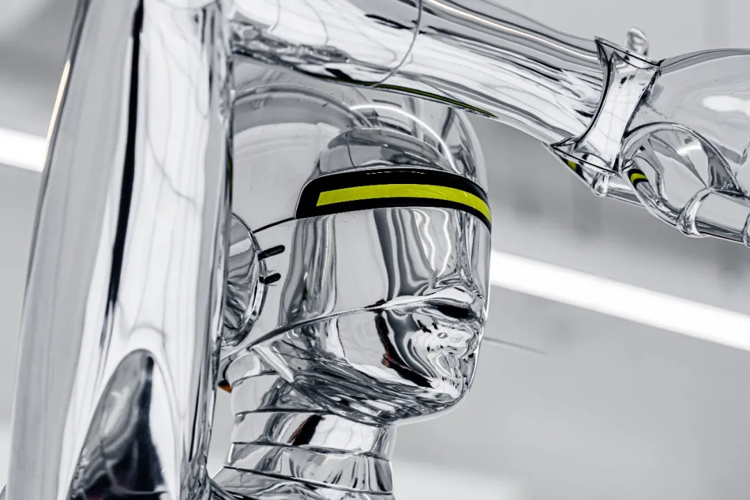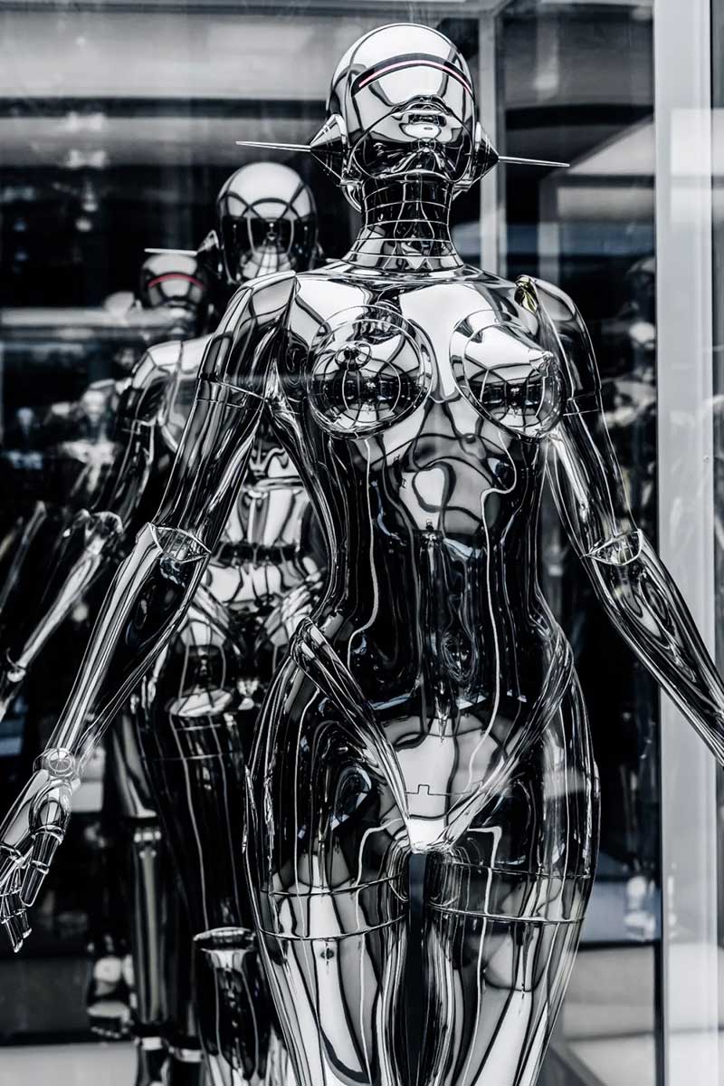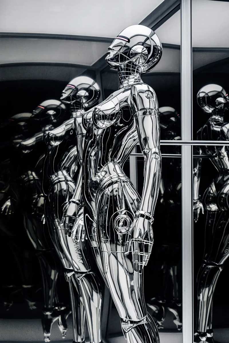 除了各种机械姬雕塑作品以外,展厅里的各种画作也极具设计感,机械姬的超现实主义美感被展现地淋漓尽致。冰冷僵硬的金属仿佛很难与性感妩媚相结合,但这幅以玛丽莲·梦露经典造型创作的机械姬,梦露的曼妙曲线加入机械元素,营造出别样的美感,还曾被殿堂级乐队AEROSMITH用作专辑封面。在展厅的后方黑色帘幕背后,隐藏着一处神秘空间,黑白光影打造出沉浸式的科幻感,是这次展览不能错过的打卡点。数座悬浮机械姬,构成了一幅宏大的画面,在白色灯光的照射下,用黑色幕布衬托出满满未来空间感,视觉冲击效果超强。在这座镜面迷宫中,你会不知道哪条路通向前方,也不知道哪座机械姬是真实的,或者哪些是幻影。能做的只有用心去感受这神奇的空间。