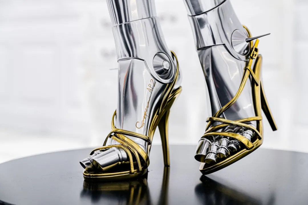 1977 年,科幻电影《星际大战四部曲:曙光乍现》上映,全世界陷入人型机械风潮。空山基结合历史钜作《大都会》为灵感,以这部德国表现主义中的女性机器人Maria为蓝本,绘制出Sexy Robot。位于展厅C位醒目位置的站立机械姬,一下子就吸引了现场观众的目光,与展出的其他机械姬不同,她拥有哑光的金属皮肤,和细节十足的专属配饰。精致的黄色高跟鞋,勾勒出更加完美的足部曲线,黄色的腿部配色和腰间细致的绑带,无不让机械姬进一步爆发女性的魅力。另一座轻轻扶额的机械姬,浑身散发出耀眼的光芒,整体造型与作品的名字非常贴切——“看向阳光”,真的完美还原了人类女性遮阳时的小动作。