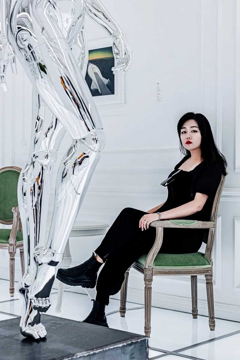 展厅的另一侧打造成了库布里克电影《2001:太空漫游》的场景,影迷来到现场一定会有身临其境的沉浸式体验。墨绿色的极简风现场装饰中,等身机械姬雕像伫立其中,手绘的画作点缀在墙面上,让人有置身于电影画面中的真实感。