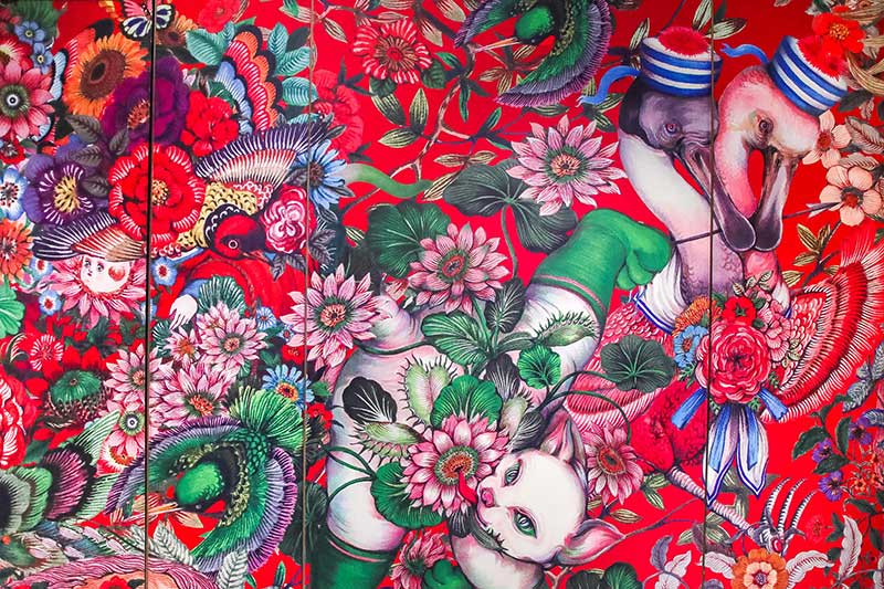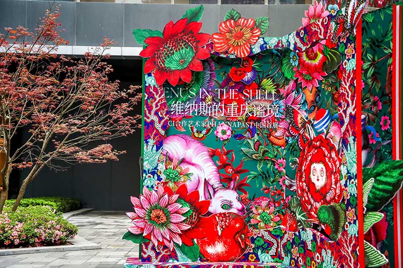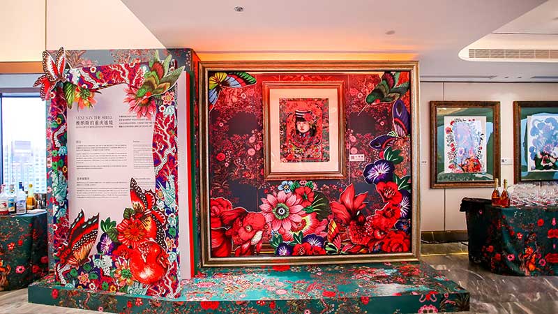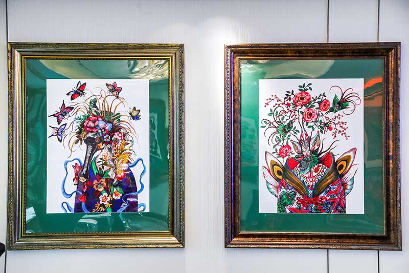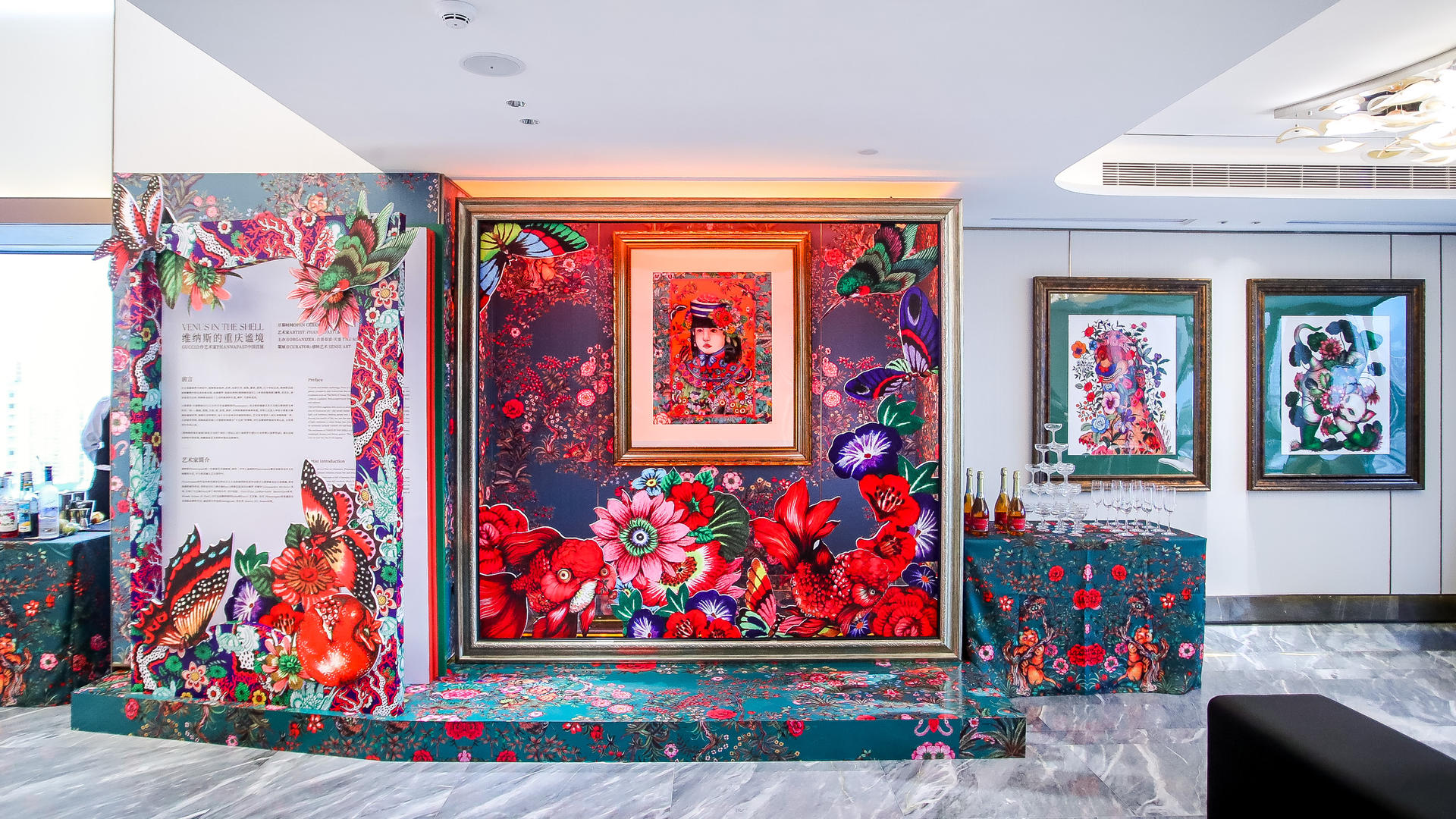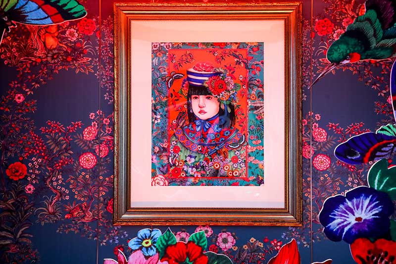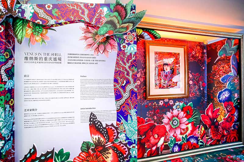 与GUCCI合作艺术家Phannapast来一场沉浸式的灵魂共鸣,用一场展览,对话艺术的精神。处于解放碑城市天际线极致视野的合景泰富·天銮云际美学馆,在GUCCI合作艺术家Phannapast的奇幻画作氛围烘托下,显得格外优雅,让人沉醉。在此次《VENUS IN THE SHELL》展览上,Phannapast的4个系列代表作品:《禁忌之花》、《曼陀罗幻想》、《月光奇想》、《逐梦花园》,以沉浸式的场景氛围,营造出一个充满东方主义色彩的奇幻浪漫世界。浓郁的色彩、奇幻有趣的动物、异域风情的花草图案,配合着优雅的大提琴和雅致的灯光投射,于云端天际之上打造出一个罕见的“异彩空间”。在这个梦幻的沉浸空间,人们通过对光与色彩的捕捉和审视,不断丰富着视觉经验,仿佛走进Phannapast画里的奇幻世界里。