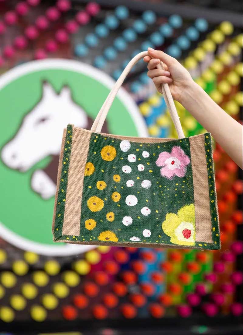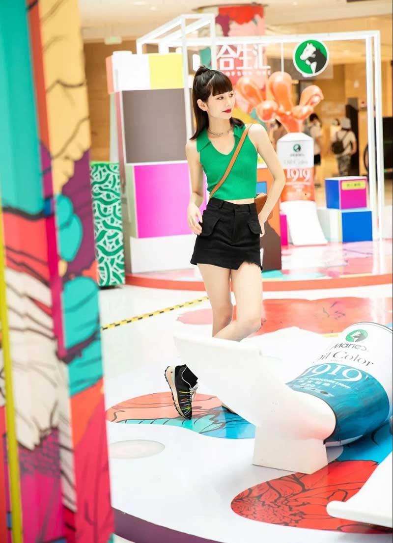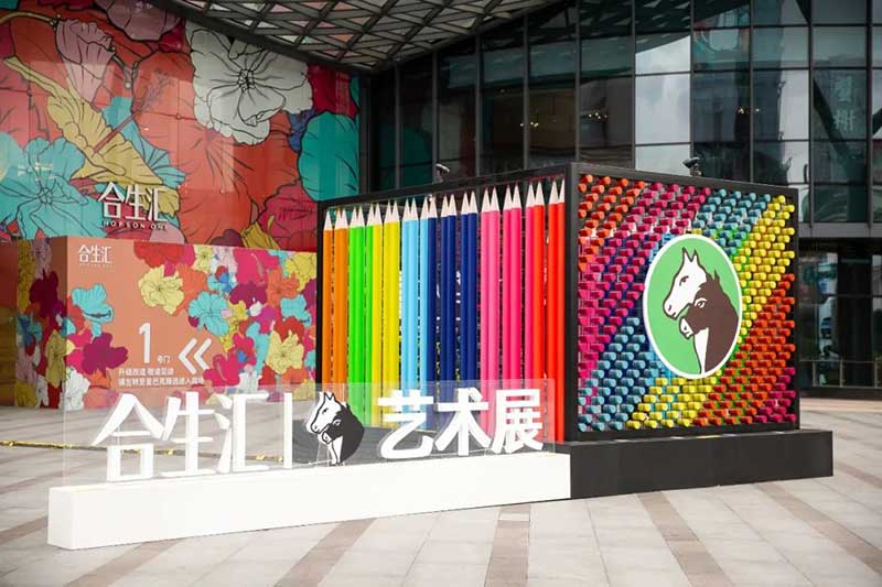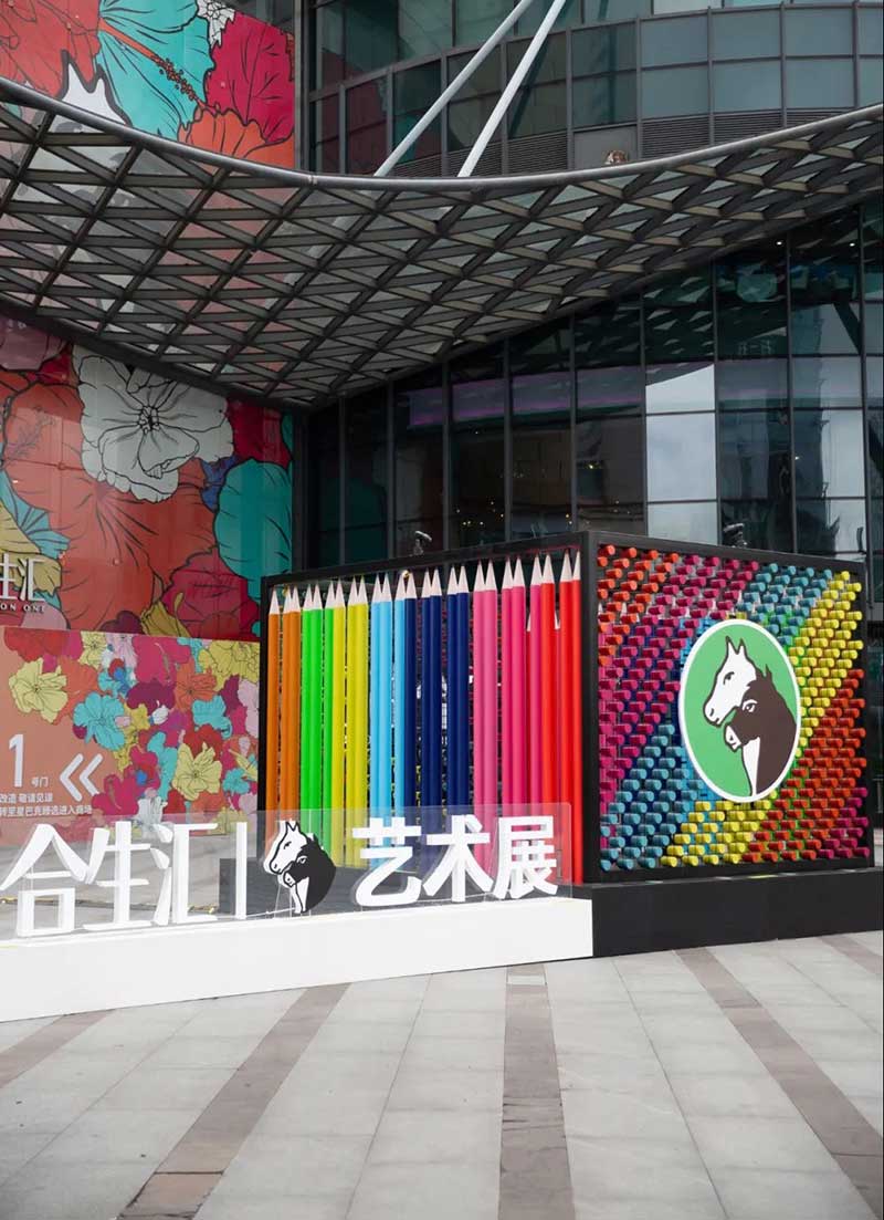 这次夏季艺术展的开幕之作共布置了4座以Marie’s马利颜料为灵感的艺术装置,还未走近商场,视线就被牢牢锁住!除了Marie’s马利家标志性的黑白双色马头logo,整座艺术装置都是由颜料棒和彩色铅笔组成,夏日橙、天空蓝、亮黄色…组成“彩虹墙”,非常好出片。商场已经变身成为“艺术花园”,大幅的花朵彩绘在商场随处可见,走进其中,一场缤纷的艺术之旅就开始了。