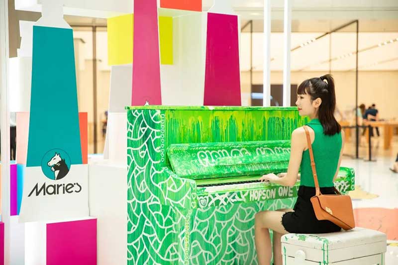 第二站来到一个色彩缤纷的「魔方空间」,整座装置由数十个彩色“魔方”组成,超大号的Marie’s马利水彩颜料散落其间,非常有趣。看到这些高低错落的彩色方块,满屏的彩色瞬间扫除情绪阴霾,拉上同伴随意拍一拍,氛围感十足!在装置的背后还藏着一个“小彩蛋”,稍微花点心思才能找到TA。艺术家们将钢琴当做“画板”,周身绘出绿叶脉络的纹理,这才是夏天的感觉嘛,逛展逛累了或者一时兴起,还可以坐下来弹奏一曲~