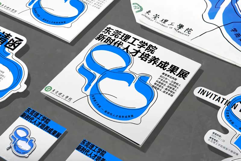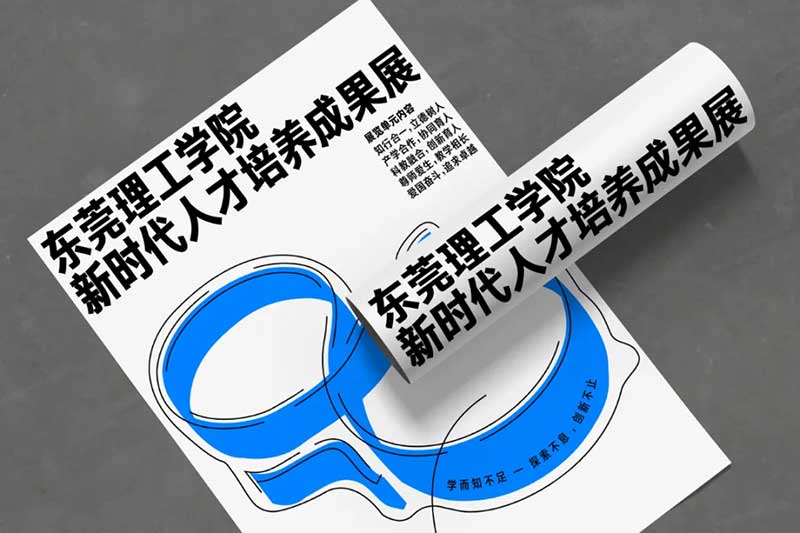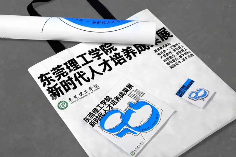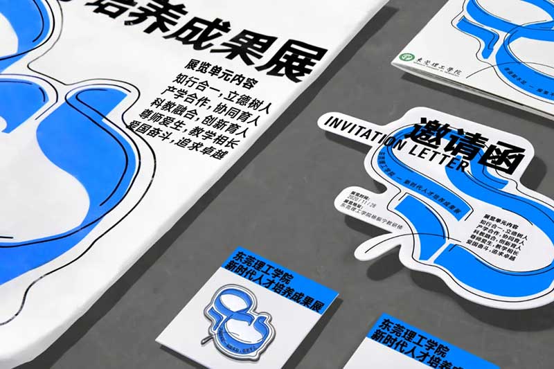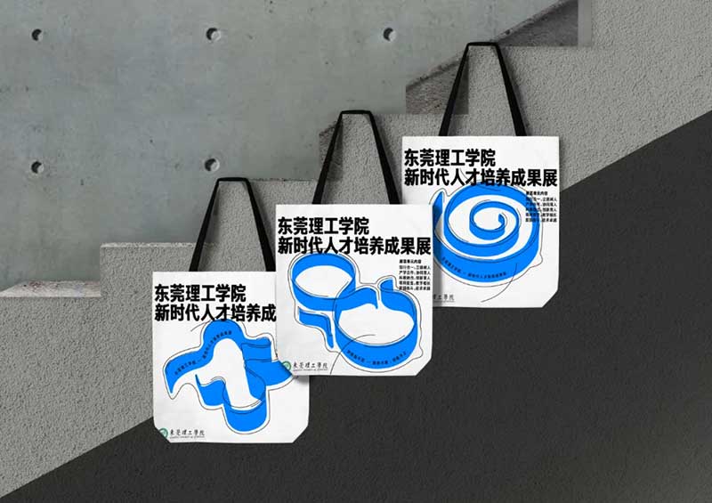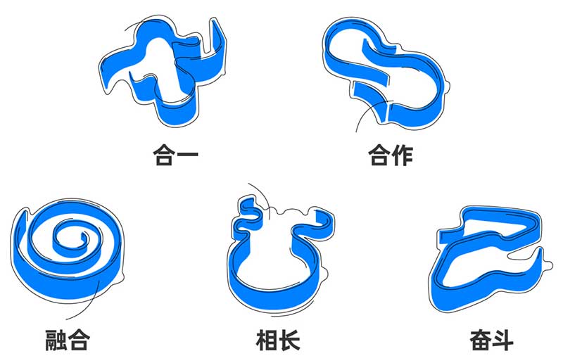 “合一” 图形:将 “合” “一” 结合转化为立体的视觉符号,引导观者聚拢在空间里,顺着流动的版式寻觅和探索 “知行合一,立德树人” 的学识精粹。“合作” 图形:层层重叠递进的格栅形成交错 “握手” 的造型轮廓,寓意 “合作” “协同” 的师生校关系,造型由单元到多元表达,同时也呼应了“产学融合创新”理念。“融合” 图形:旋转向上的曲线波纹,滴水交融滋养万物,激活了 “科教融合、能力培养、创新育人” 的教育理念。“相长” 图形:同向流动的曲线如同学生与教师之间的关系,以学生为主体,教师为主导,教与学密切互动、相互促进、共同成长。“奋斗” 图形:如河流曲折蜿蜒,却奔流不息,站在成长的折返点上,仍旧激发持续不断探索钻研的动力,它高度凝聚着大学使命,是莞工发展进步的强大动力和不竭源泉,也是 “爱国奋斗,追求卓越” 的精神体现。