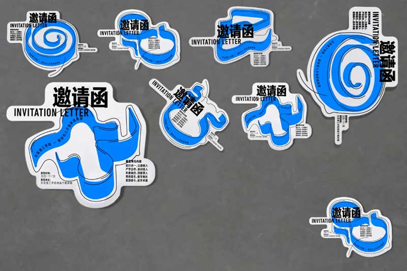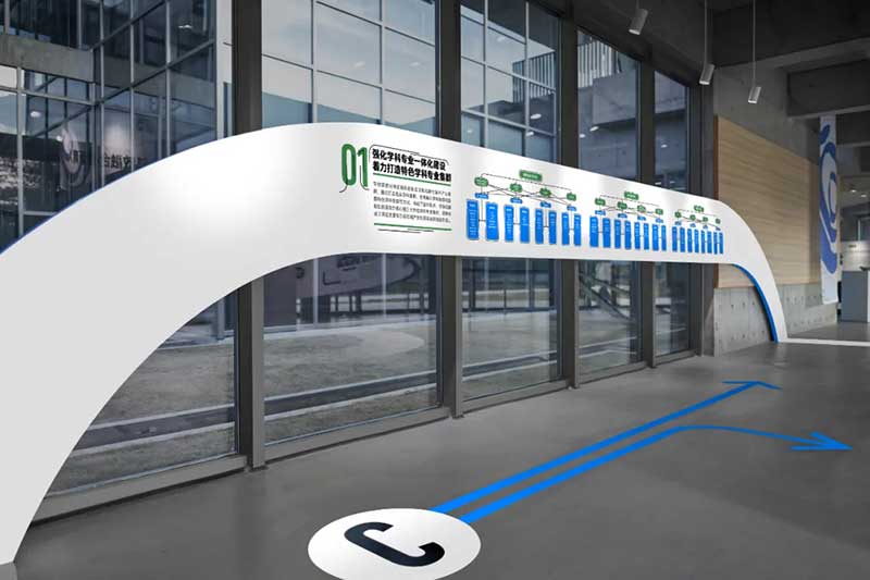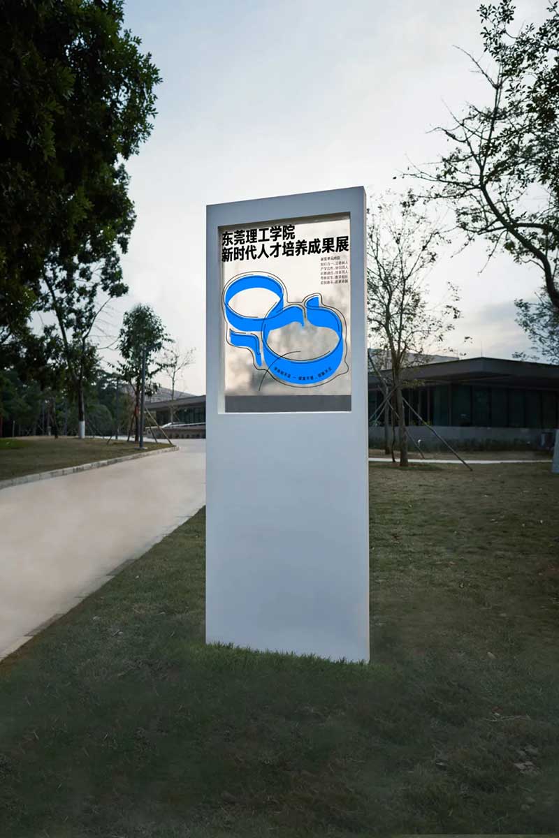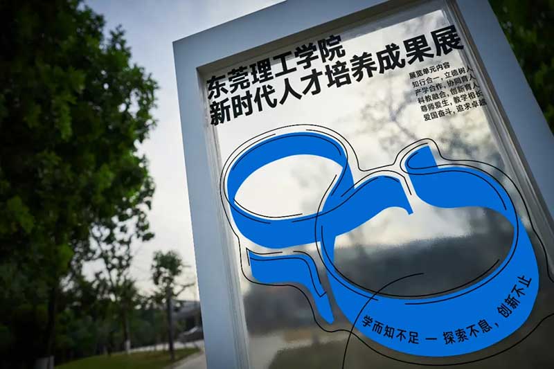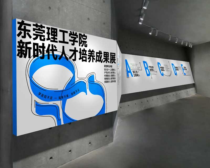 从莞工 “学而知不足” 的校训出发,里面蕴含着学无止境的进取精神、虚怀若谷的学习态度和教学相长的教育理念,进取学习的青春永远带着无限的想象和无限的可能。展览提取了与莞工求学精神相契合的概念符号 “ ∞(无穷大)”,延生而出的概念图形寓意着新时代教育背景下科技创新的无限发展和追求。团队将原本枯燥、单一的视觉符号 “ ∞ ” 与莞工进取的治学理念相融合呈现出开放流转的空间图形,概念图形寓意在新时代教育背景下科技创新的无限发展和进步。