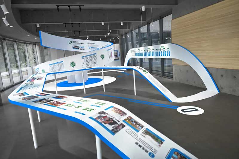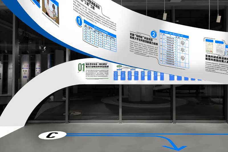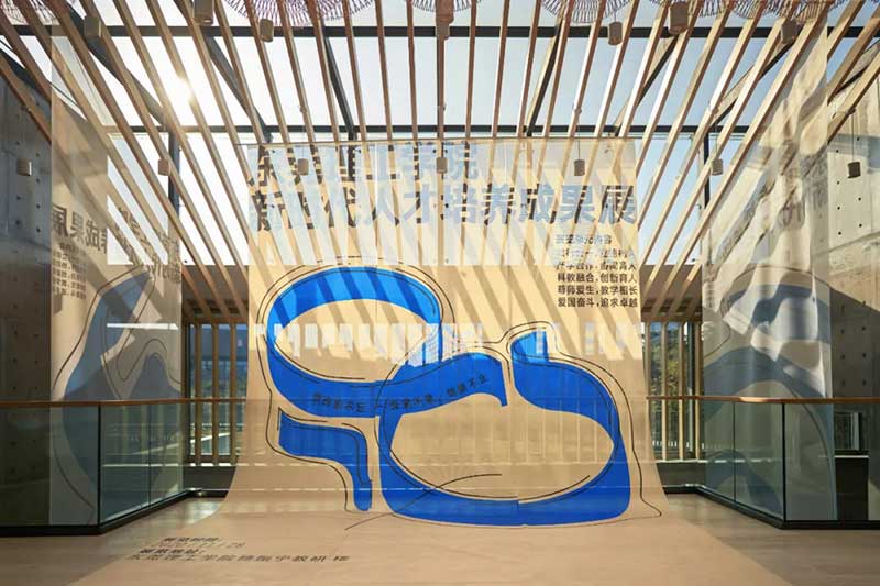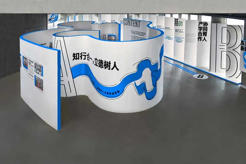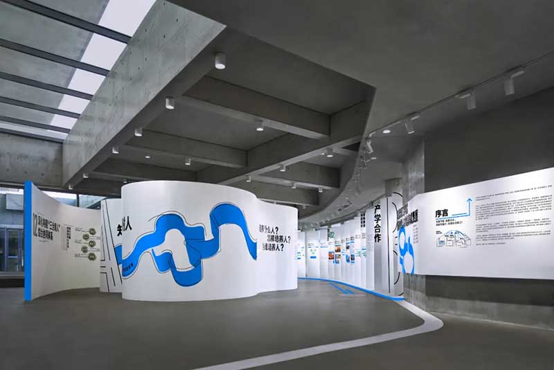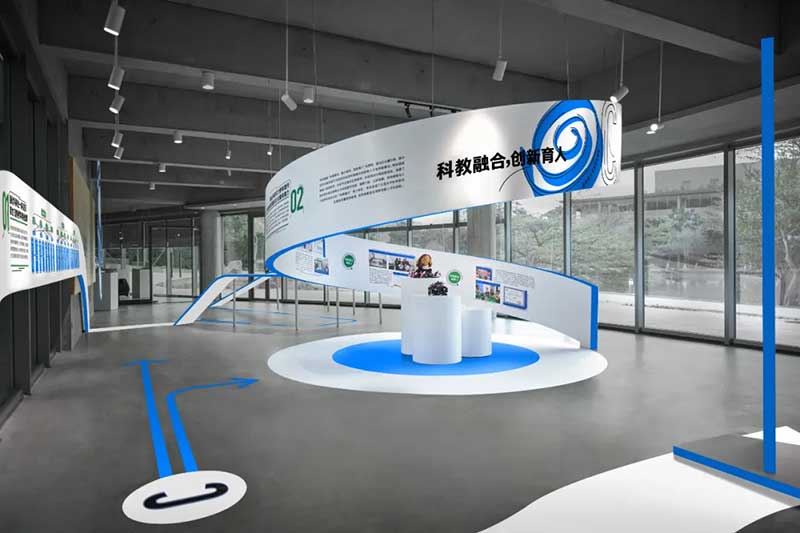 围绕概念视觉符号 “ ∞ ” 将 “知行合一,立德树人”、“产学合作,协同育人”、“科教融合,创新育人”、“尊爱师生,教学相长”、“爱国奋斗,追求卓越” 的教育理念及思想,分别衍生设计出符合展览5个单元概念及内容的视觉符号,从中提炼出 “合一”、“合作”、“融合”、“相长” 和 “奋斗” 5个关键词为线索,将文本转化为系列视觉图形后,立体化成空间展览形态,串联呈现在裸露的 “清水混凝土” 空间里,让文本-概念-平面图形-立体结构,从虚到实一气呵成,这也是设计的有趣之处。