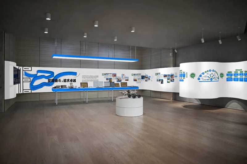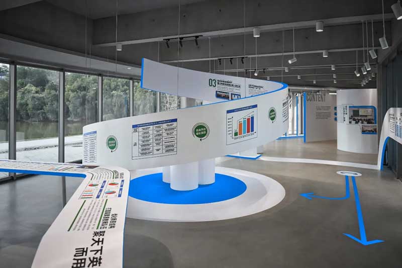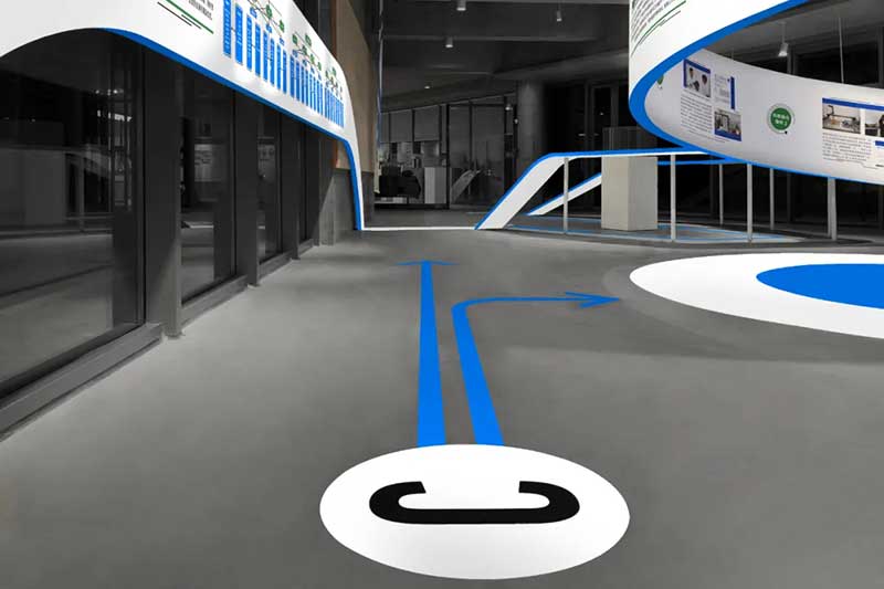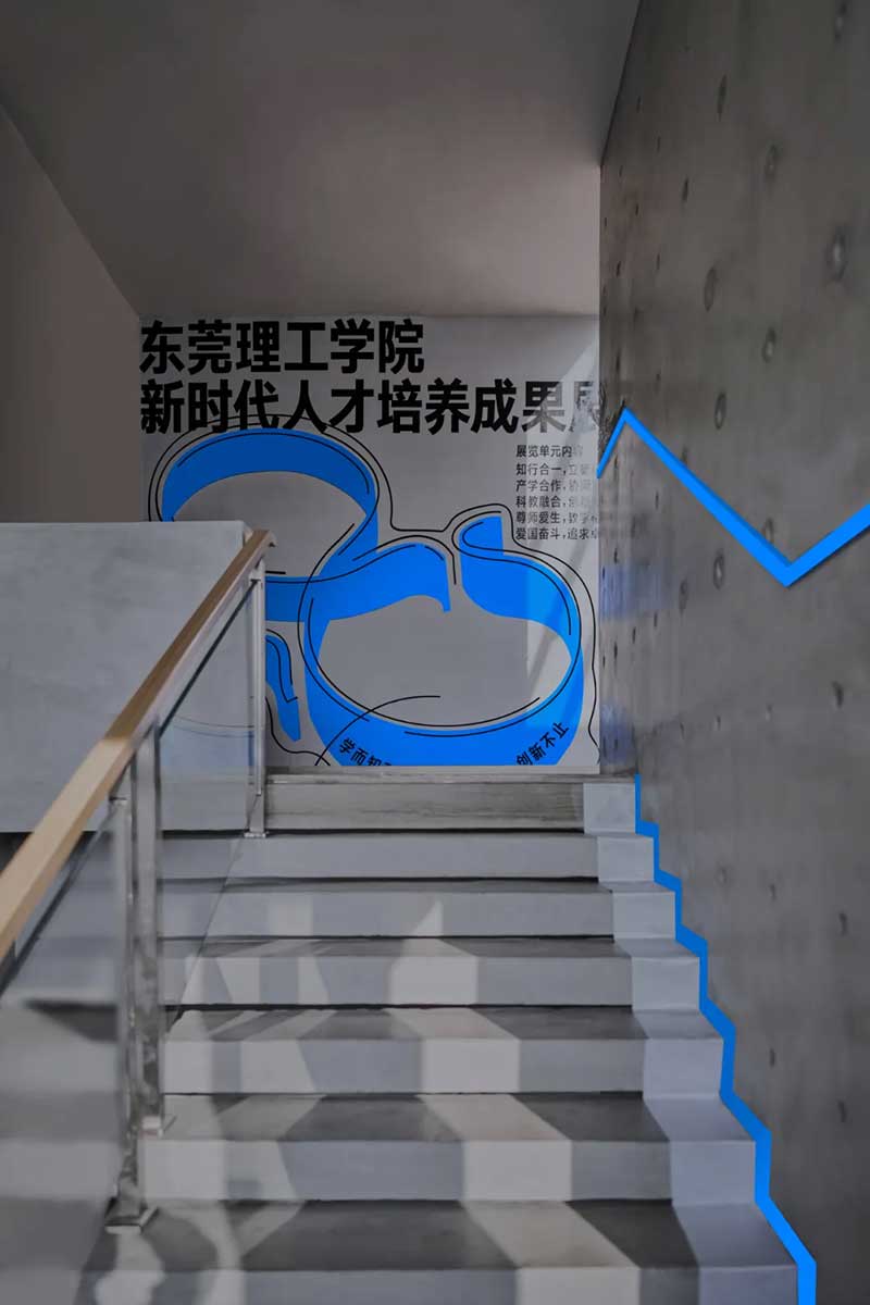 流转的空间图形与科技感的荧光蓝搭配,让安静的 “清水混凝土” 空间,更显科技创新感、未来的穿梭感与宽阔的探索精神。