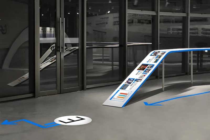 为了让观者感受不同的空间体验,展览大胆地以点线面的方式,将5个单元的视觉符号转译在裸露的 “清水混凝土” 空间里,由于空间可支配性原因,原本复杂抽象的创新科技感的设计语言,通过细节,弧度的呈现下变得可见,可懂,可感受。二楼入口到一楼展厅的路径,移步换景,从二楼入口垂帘幕布的视觉冲击,到楼梯间停顿平台观望一楼展厅展陈在建筑的光影下静待,再到展览前言的阅读。抑扬又顿挫,带来感官起伏体验的同时,又利用楼梯空间的缓冲,让观众 “静” 入观展状态。