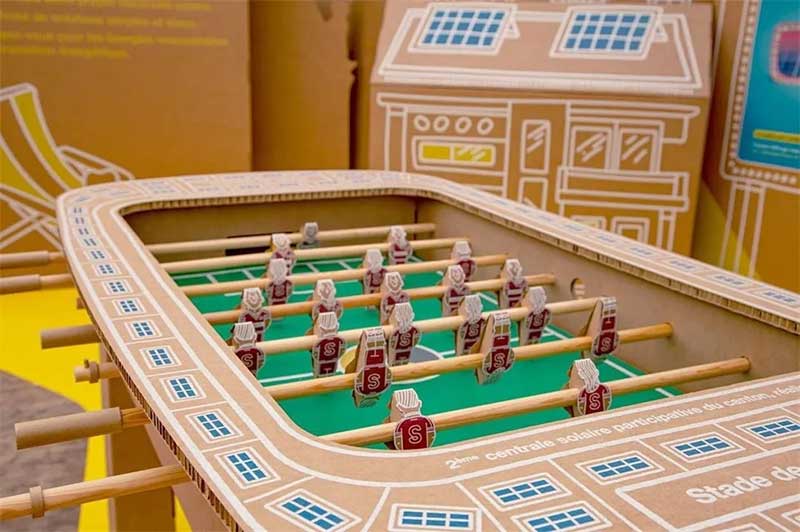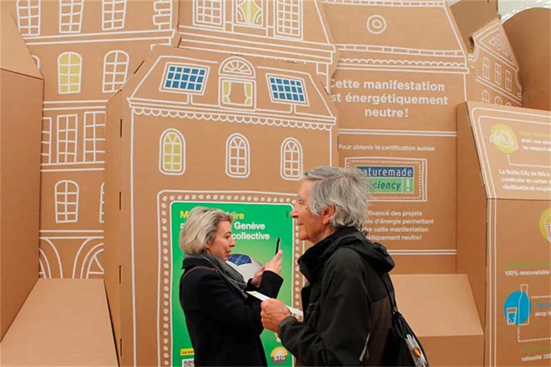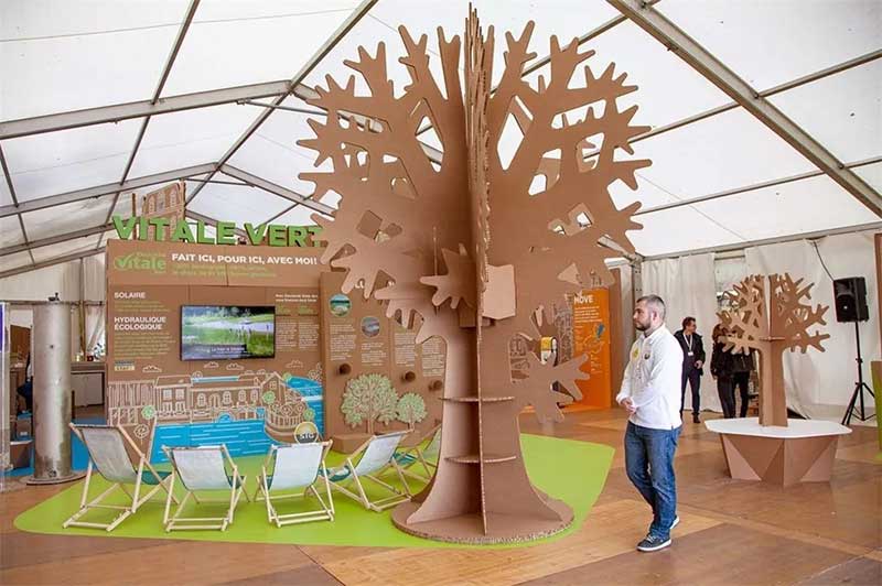活动现场分为专门展示地热能的区域,专门介绍水及其在城市中的使用的区域,专门介绍太阳能的区域以及一个介绍公司本身的区域,而当地的动植物也在展览中占有了一席之地。这里还有一个空间,专门展示节能技术,另一个特别的空间位于帐篷的附属部分,专门用于街头艺术。通过连接模块展示墙纸板的后方,利用墙表面的绘图设计来讲述品牌的故事,在整个活动帐篷的四周安装着这种展示墙,这种结构所用的材料是7毫米厚的BC瓦楞纸板,墙体的高度根据区域的不同在2.5米到3米之间变化,向公众提供的信息主要是用白色墨水打印的,仅对某一些概念或局部画面用特别颜色突出。一些照相道具部分地解决了现场与客人互动的问题,这里成为了最繁忙的区域之一。