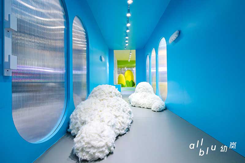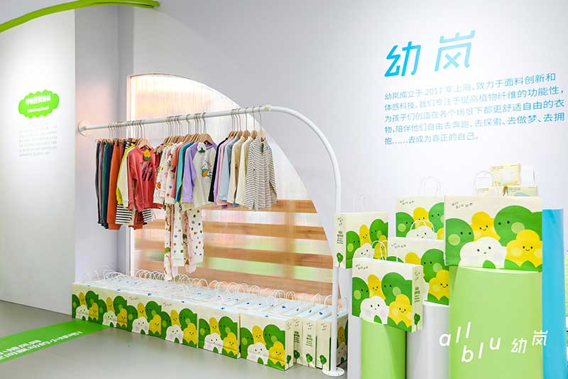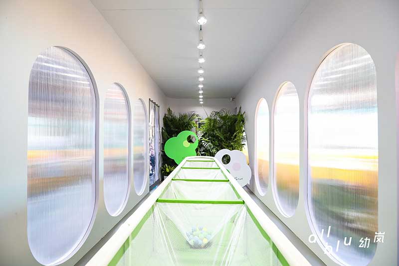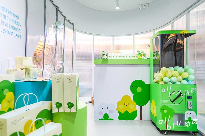 小岚友加油站,作为孩子体验植物超能力的第一站,不仅是商品展示区,也是整个故事线的出入口,从这里出发,孩子们参与到不同的植物场景体验中,根据游戏提示完成任务,集齐印章,最终从扭蛋机中免费兑换奖品,让孩子们在游戏中直观感受“植物超能力”。呼吸桉树森林中,多种多样的绿植让他们仿佛置身于森林之中,尽情地捕捉在风中飘动的小球,别样的游戏互动,有趣之余,也让小朋友感知到幼岚桉树系列产品的轻盈透气感。弹弹玉米乐园中,用海绵块和海洋球来填充的金黄灿灿玉米海洋,小朋友们可以在蹦床上尽情弹跳,通过弹跳游玩形式表达幼岚玉米系列产品的高弹特性,除此之外小朋友们还能用表情魔术贴创作玉米超人的五官,增加游玩趣味。棉棉躲藏空间中,用白、蓝色的懒人沙发和鹅卵石抱枕营造“柔软”的氛围,在这柔软的空间中,小朋友通过寻找衣服上的“植物超人”直观感受衣物的舒适,还有满满知识点的植物科技面料陈列墙,让家长和小朋友零距离触摸幼岚产品的舒适柔软,了解每一块面料背后的故事。
