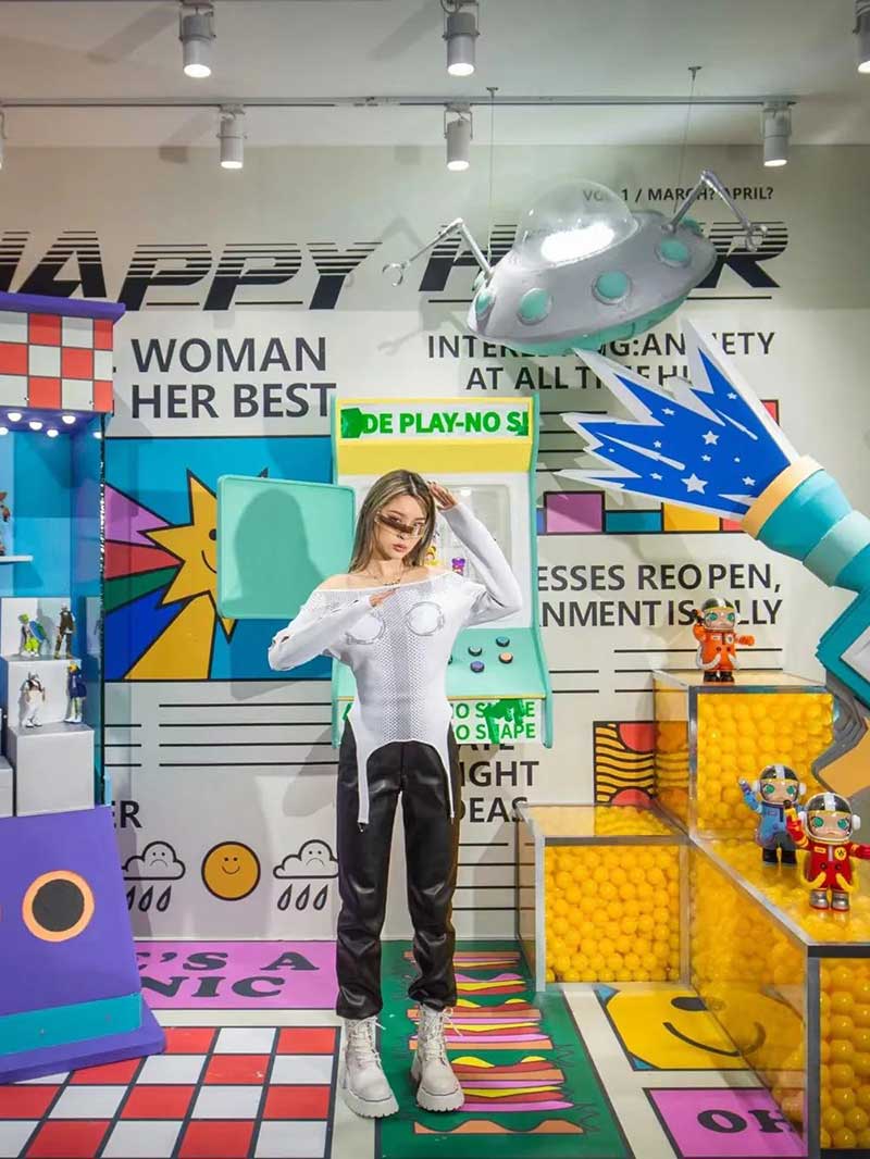 天猫竟办了个线下潮流艺术展!走进内场,这条笔直的“新光大道”实力瞩目,一个个别具特色的橱窗组成五大特色街区,一座7200㎡的Z世代潮流之城呈现于我们眼前,现场随处可拍、一秒可出大片,不必再羡慕纽约第五大道,引领潮流的未来之城,已触手可及,街区中的五组艺术橱窗由四位先锋艺术家(艺术工作室)宋三土、吴征、WM Studio、刘潇倾力打造,浓重色彩点缀、神秘涂鸦装饰,美妆奢品橱窗首先抓住我们的目光,以八大行星与希腊神话为灵感,“少女毕加索”、鬼才艺术家宋三土,将一个个场景打造的如梦似幻。橱窗里,祖玛珑限定新香、BOTTEGA VENETA“绿枕头”等各式新品分布其间,潮流新品和进入橱窗的我们,仿佛一同融入魔幻色彩世界。