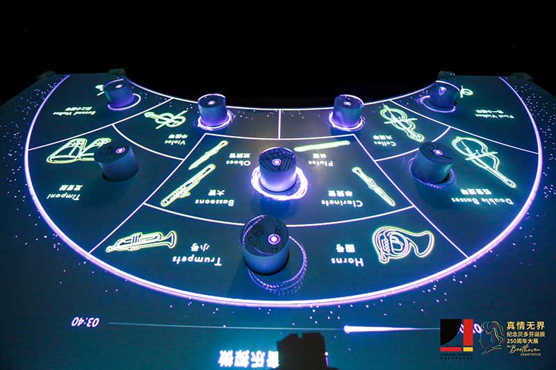 展区将贝多芬的作品以色彩渲染的互动投影方式,使每一位进入的观众都可以置身于色彩画卷之中,实现人们将音乐留在镜头里的奇思妙想。巨大的投影墙上、不同色彩踏着《命运交响曲》的节奏变幻和流动,每种颜色代表着不同的情绪,通过双手触摸与之互动,更容易理解音乐家在作品中意图表达的情感与内涵,并通过视觉感受,体会音乐的感染力。