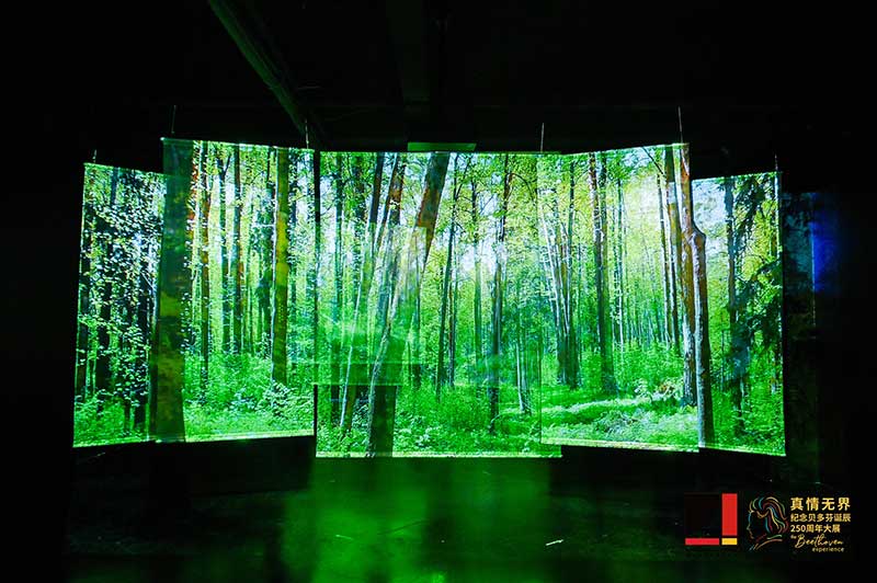 360度环幕电影的展区,影片用一种沉浸式的环幕特效展现,从波恩的乡村到维也纳的宫殿,前一幕将人带到18世纪的德国波恩,那个贝多芬出生和成长的城市;后一幕,画幅缓缓揭开,耳旁响起激昂震撼的乐章,又仿佛置身音乐厅,营造出一个”沉浸式”的封闭空间,让人有一种身临其境的错觉。