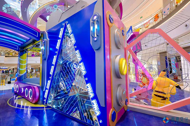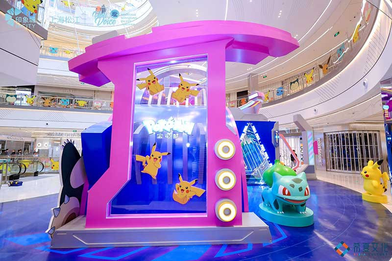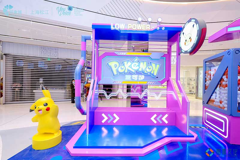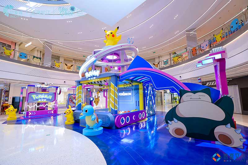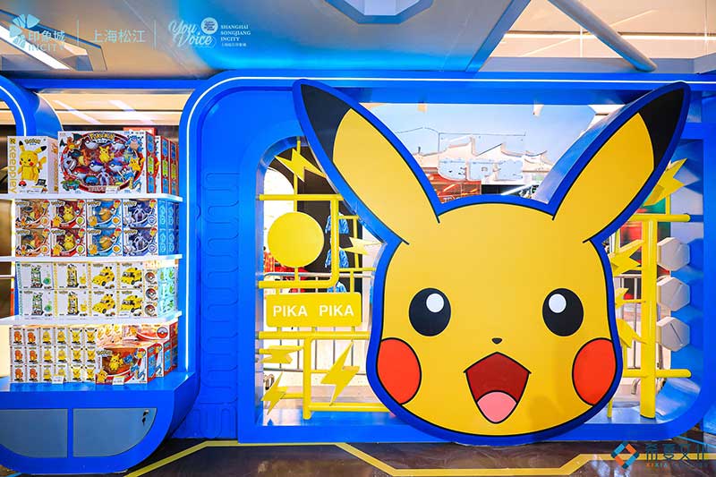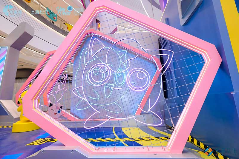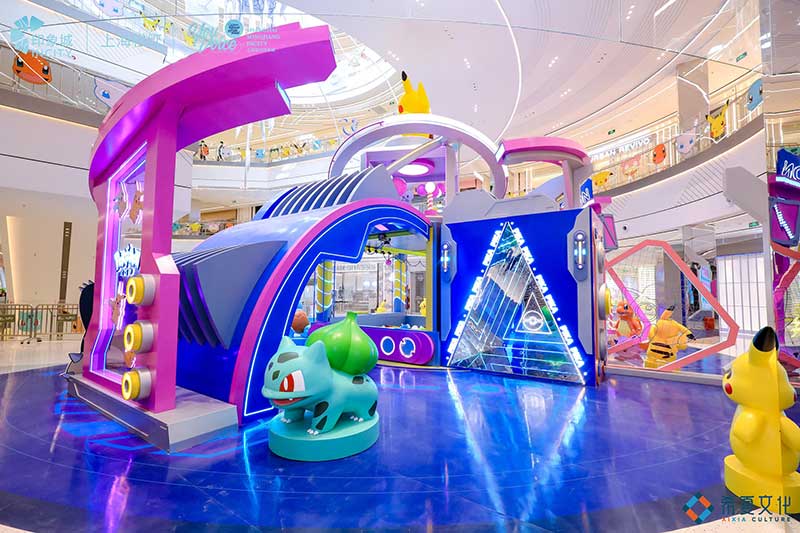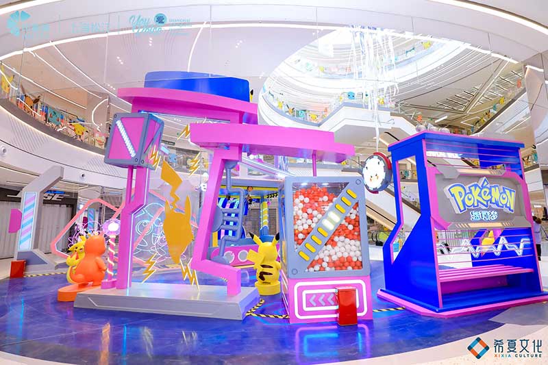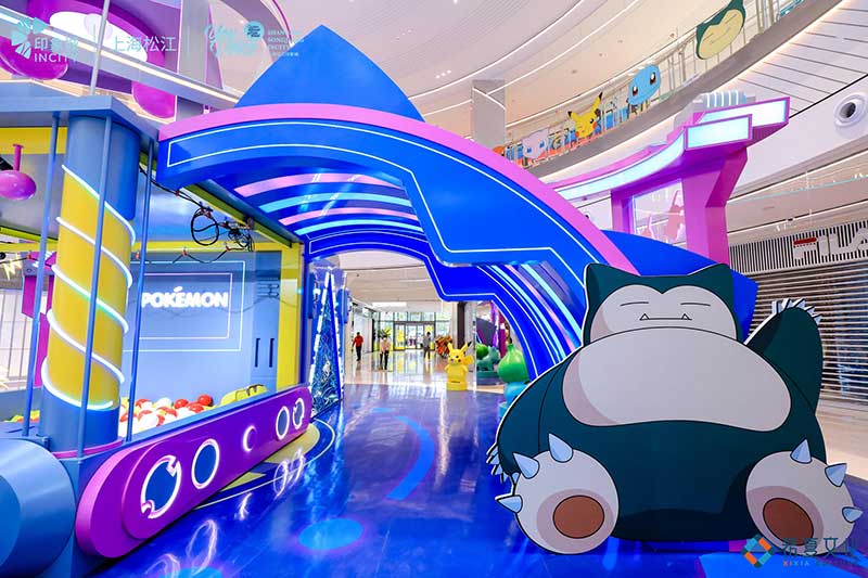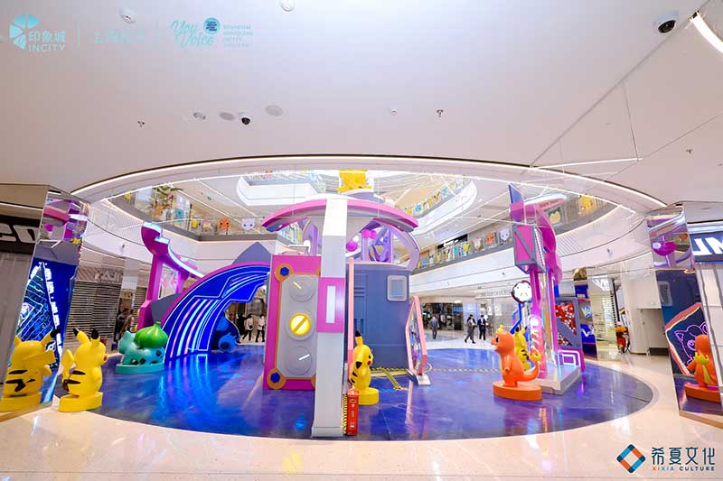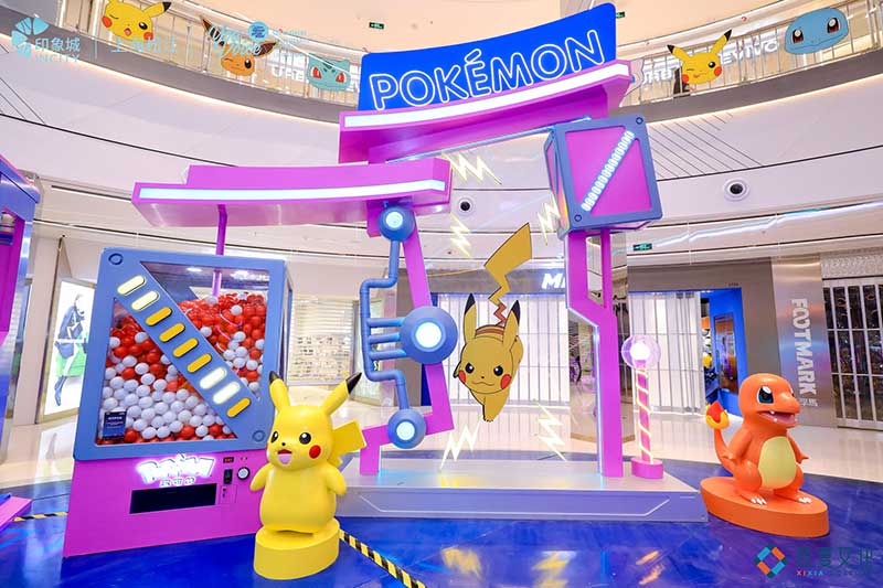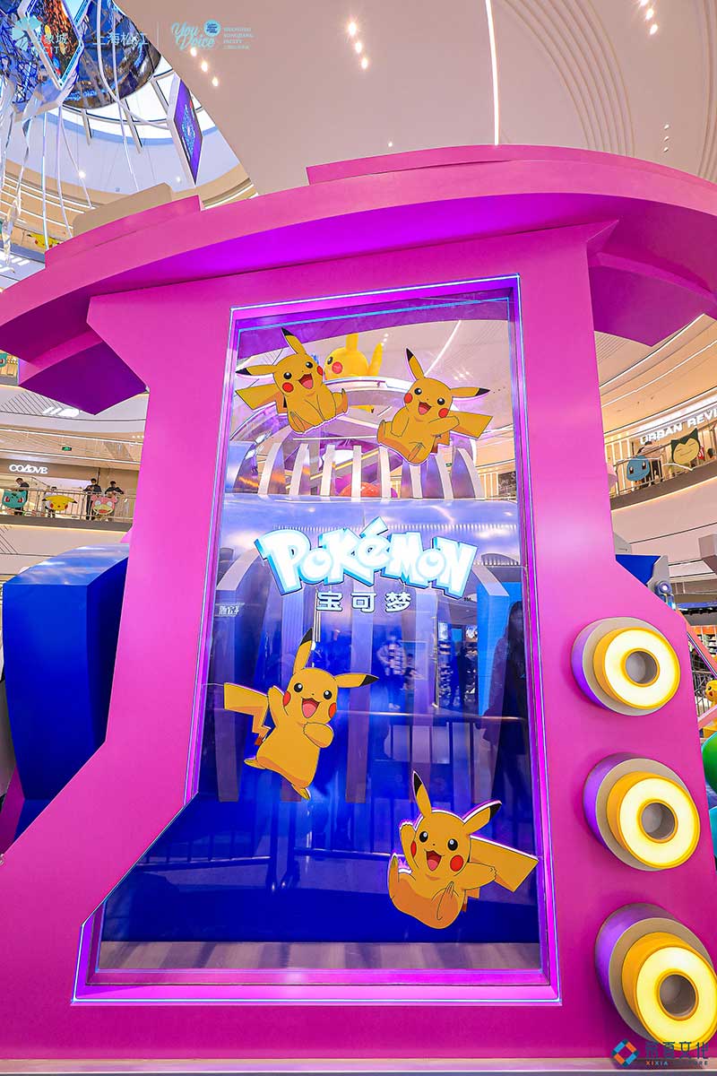 宝可梦形象全新主题活动首展“宝可梦跨次元之旅”,运用蓝紫色调的主打色,在L1设置宝可梦车站、宝可梦训练营等场景,还有扭蛋机、大型娃娃机等互动装置,创造出跨次元的趣味体验。